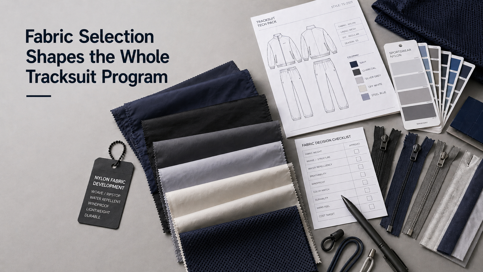 Nylon fabric choice affects the look, hand feel, comfort, structure, cost, and production stability of a custom tracksuit. For private label brands, the fabric is not just a material decision. It influences fit, lining, trims, logo methods, sample revisions, and bulk production consistency.