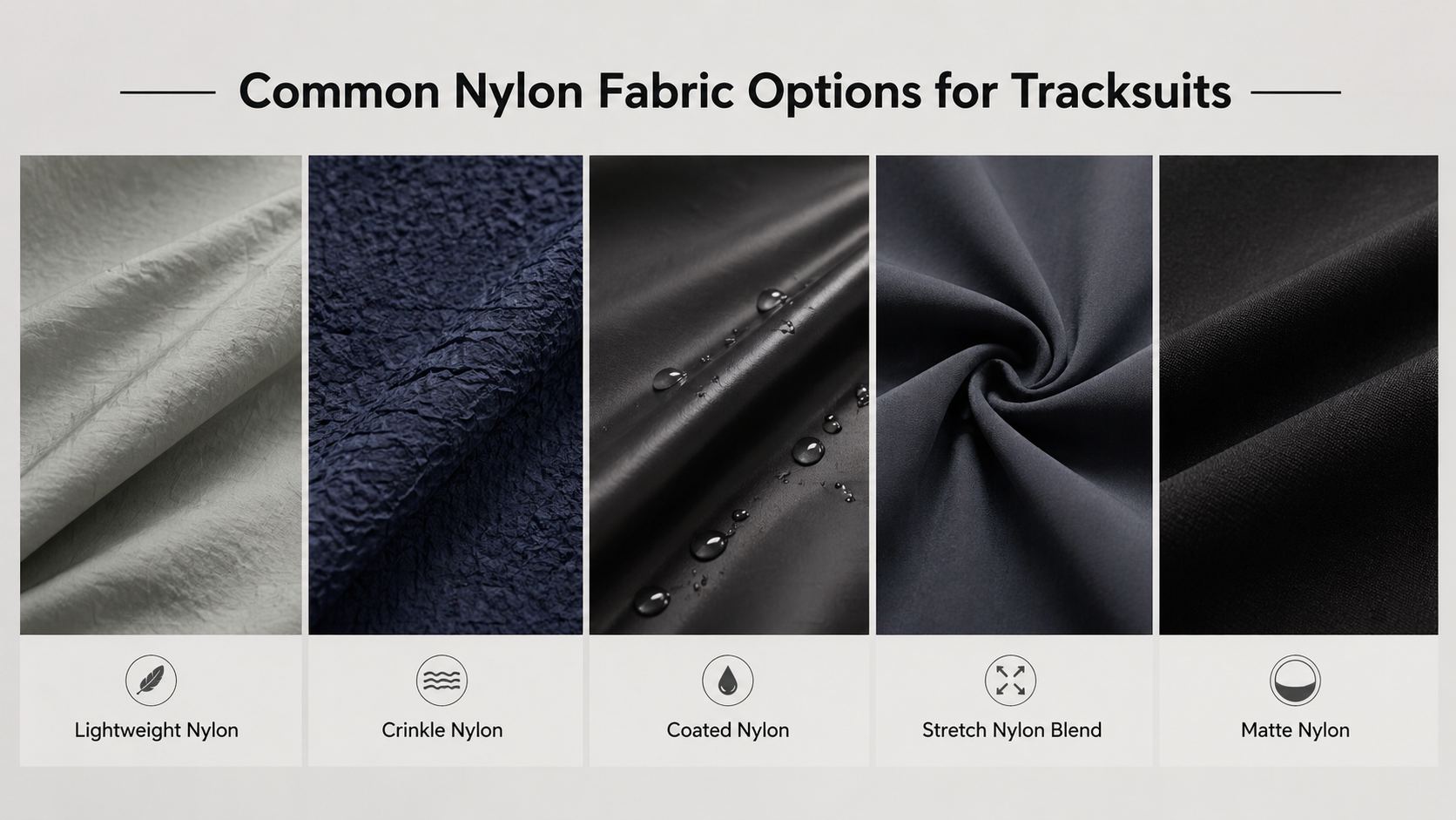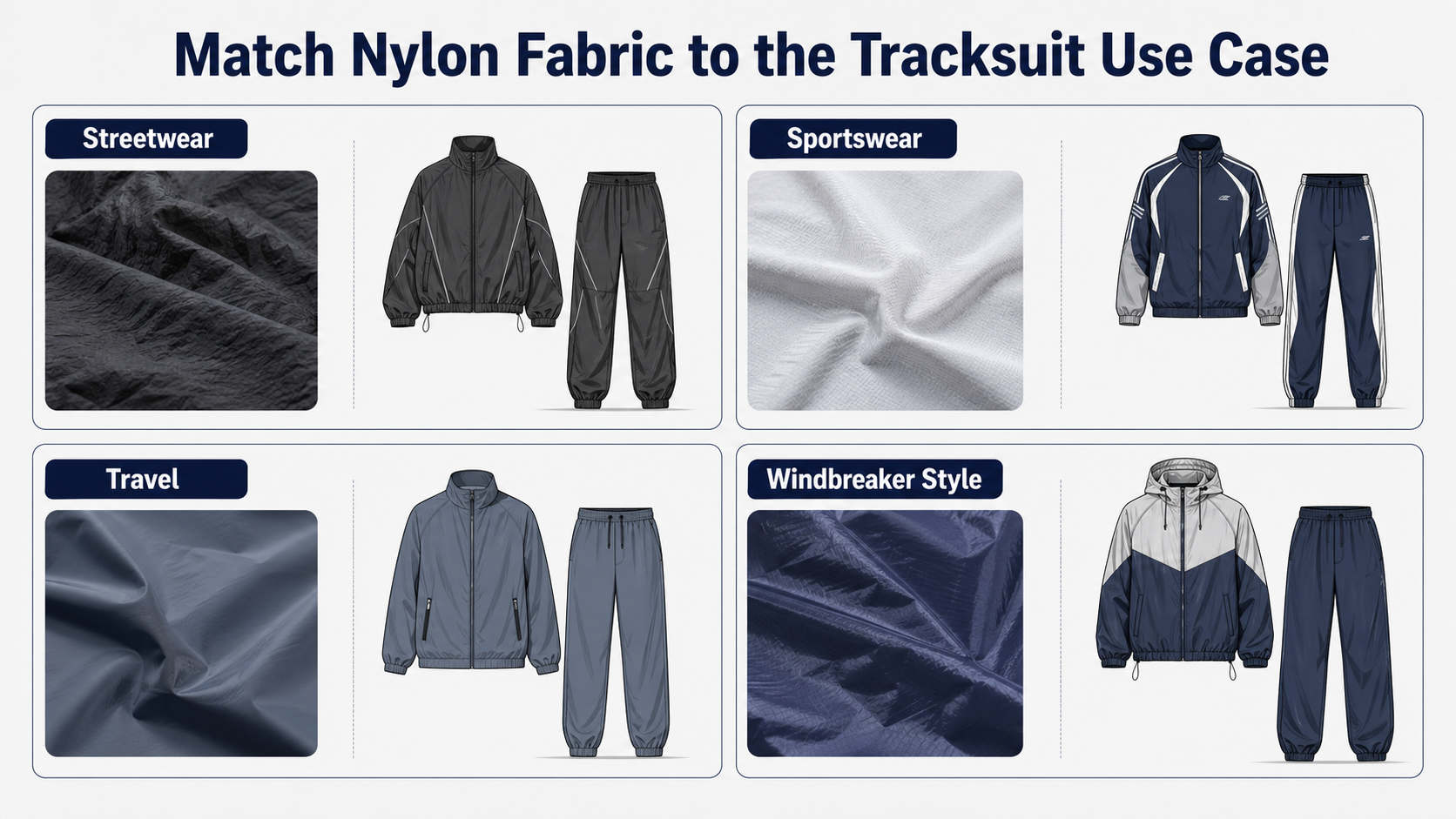 Common nylon directions for tracksuits include lightweight nylon, crinkle nylon, matte nylon, coated nylon, and stretch nylon blends. The best option depends on the target use, hand feel, lining, fit, branding method, and price level.