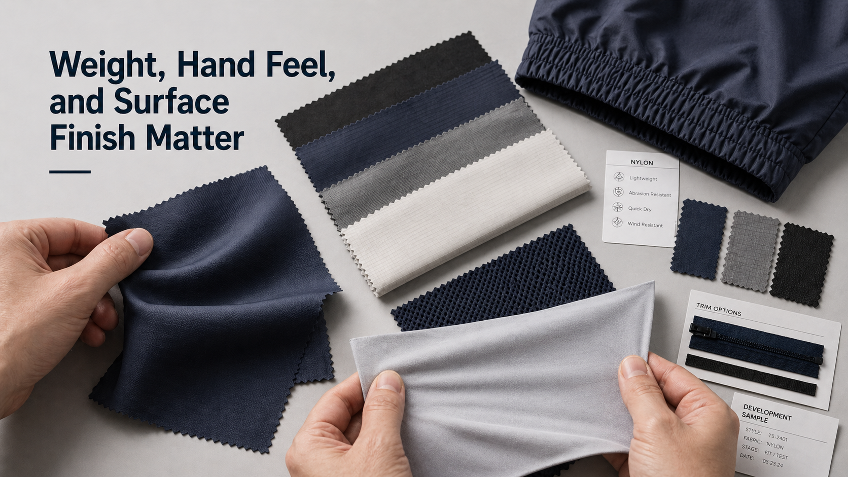 A fabric decision is not complete until the sample is reviewed as a finished garment. The buyer should evaluate how the nylon behaves after sewing, fitting, branding, lining, and trim application.