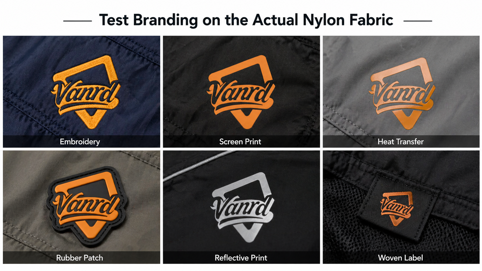Branding methods should be checked on the actual nylon fabric before bulk production. The surface finish, coating, heat sensitivity, and fabric weight can affect how logos appear and how stable they remain.