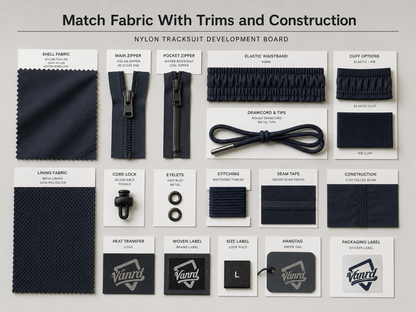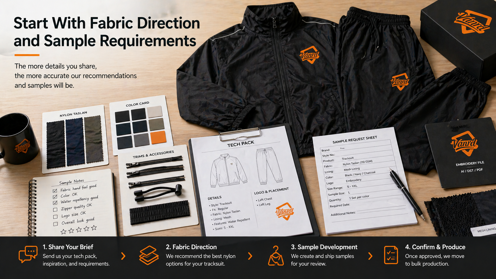 For fabric selection, trims, printing, embroidery, finishing, and customization options, buyers can review Vanrd's Fabrics & Techniques.
