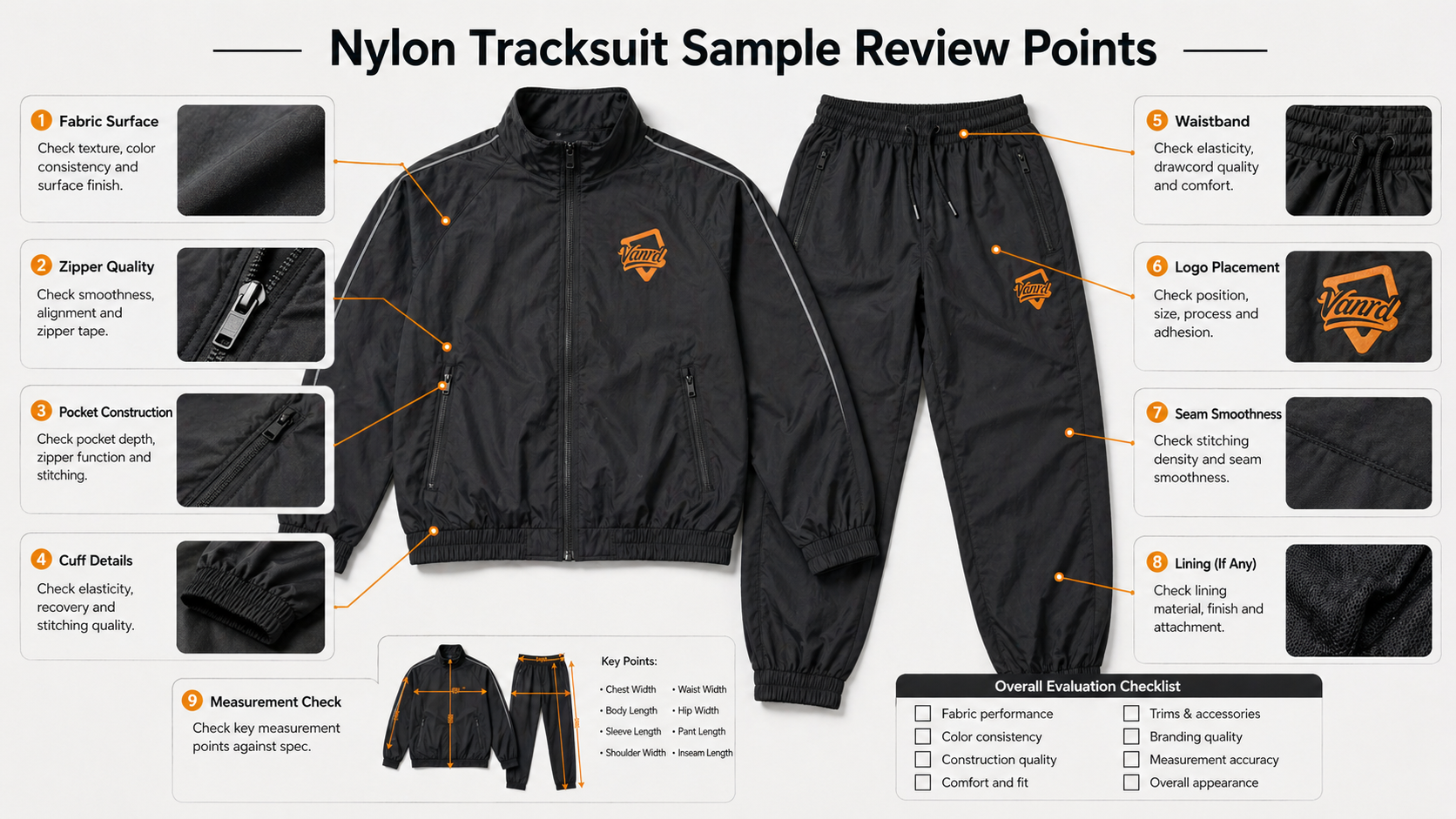 Fabric weight, hand feel, and surface finish are three of the most important checks before sampling a nylon tracksuit. These factors influence how the garment looks on the body and how buyers perceive its quality.