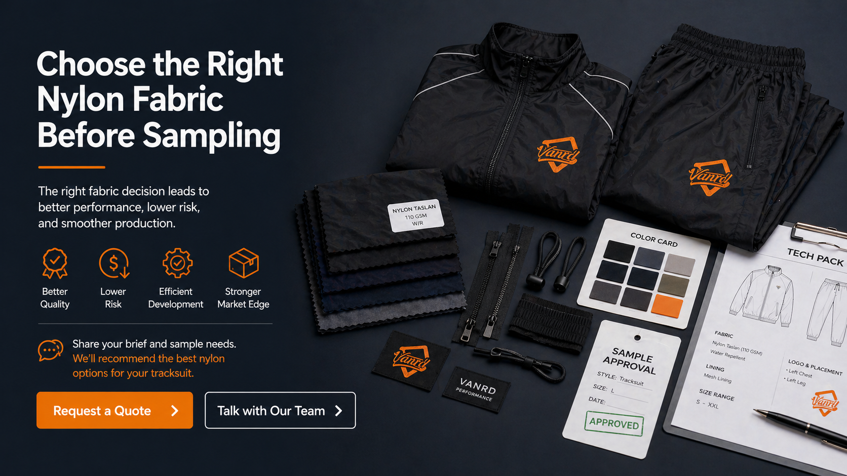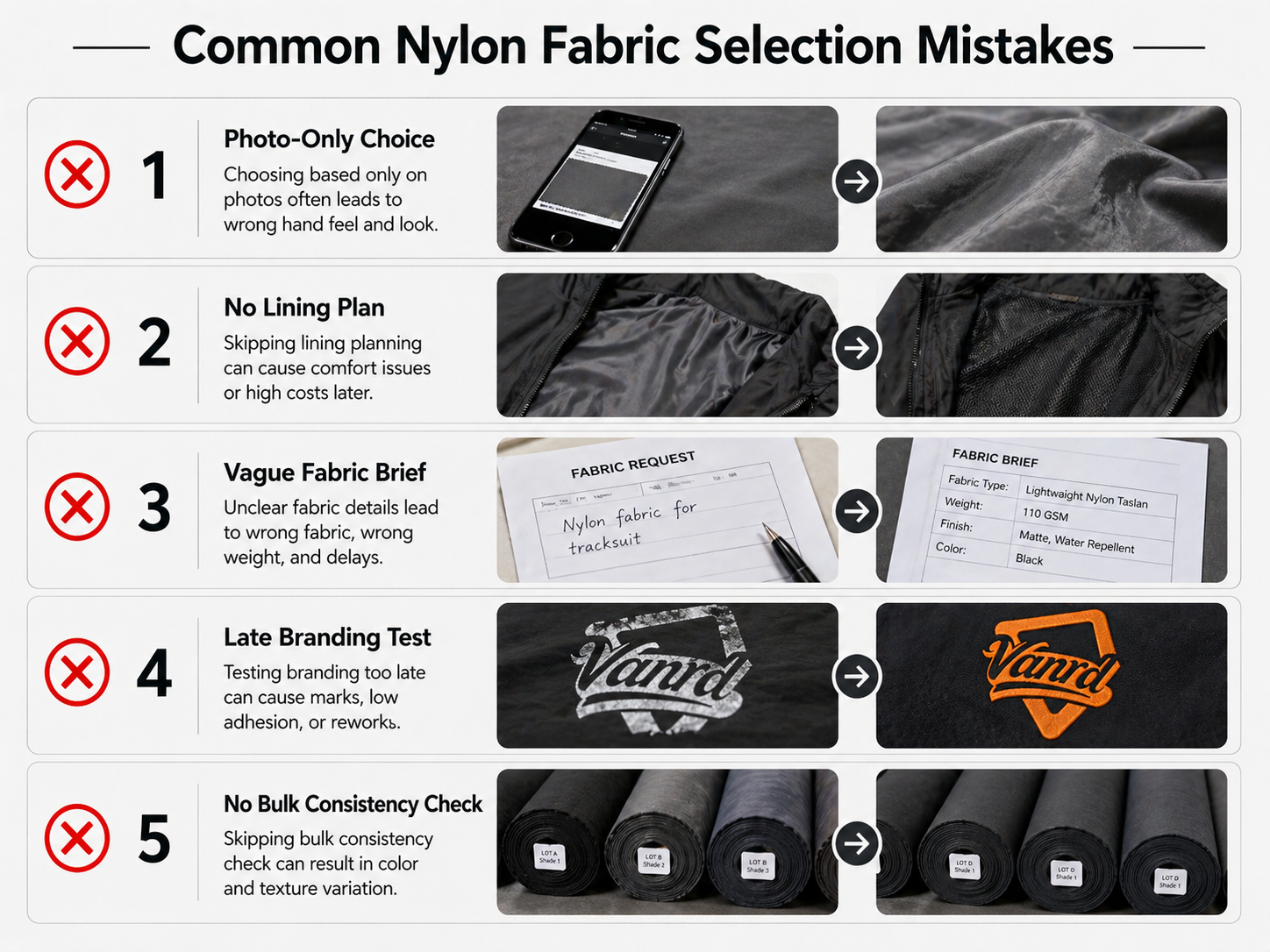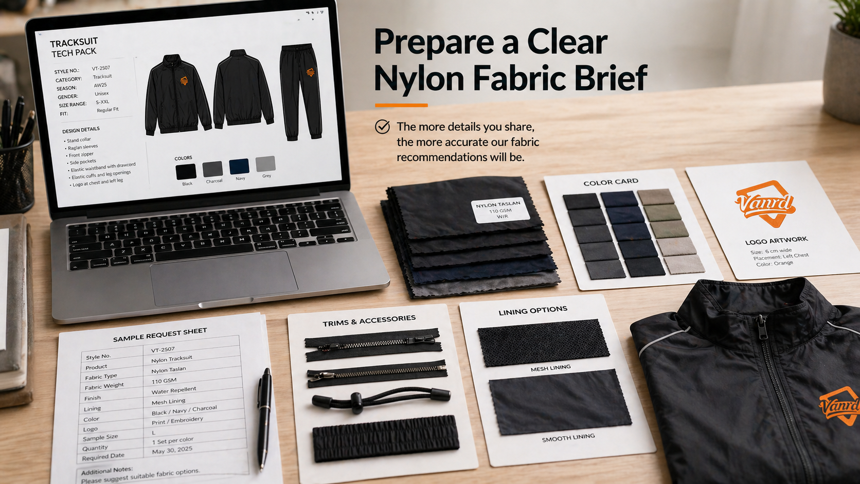 Send Vanrd your tech pack, reference images, target use case, fabric direction, logo artwork, lining preference, trim details, and order planning information. Our team can review your requirements and help you compare suitable nylon fabric options before sampling.