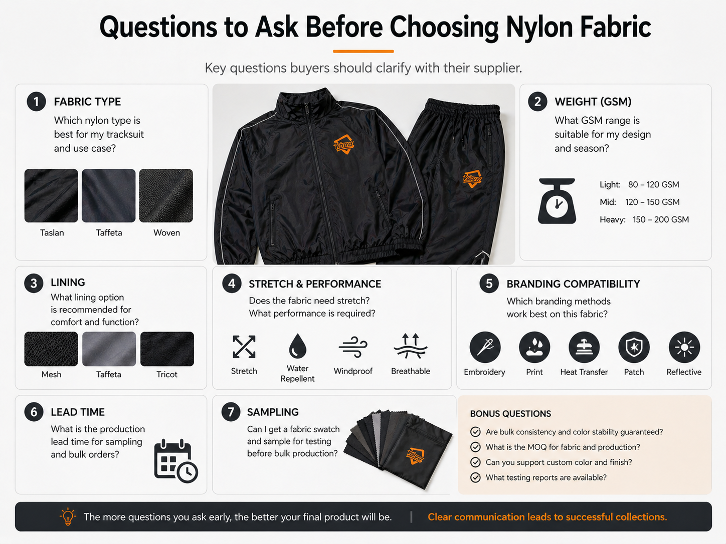 This is why buyers should not ask only for "tracksuit nylon fabric." A better approach is to define the intended use case, target price level, fabric hand feel, surface effect, stretch requirement, lining preference, and branding method before sampling.