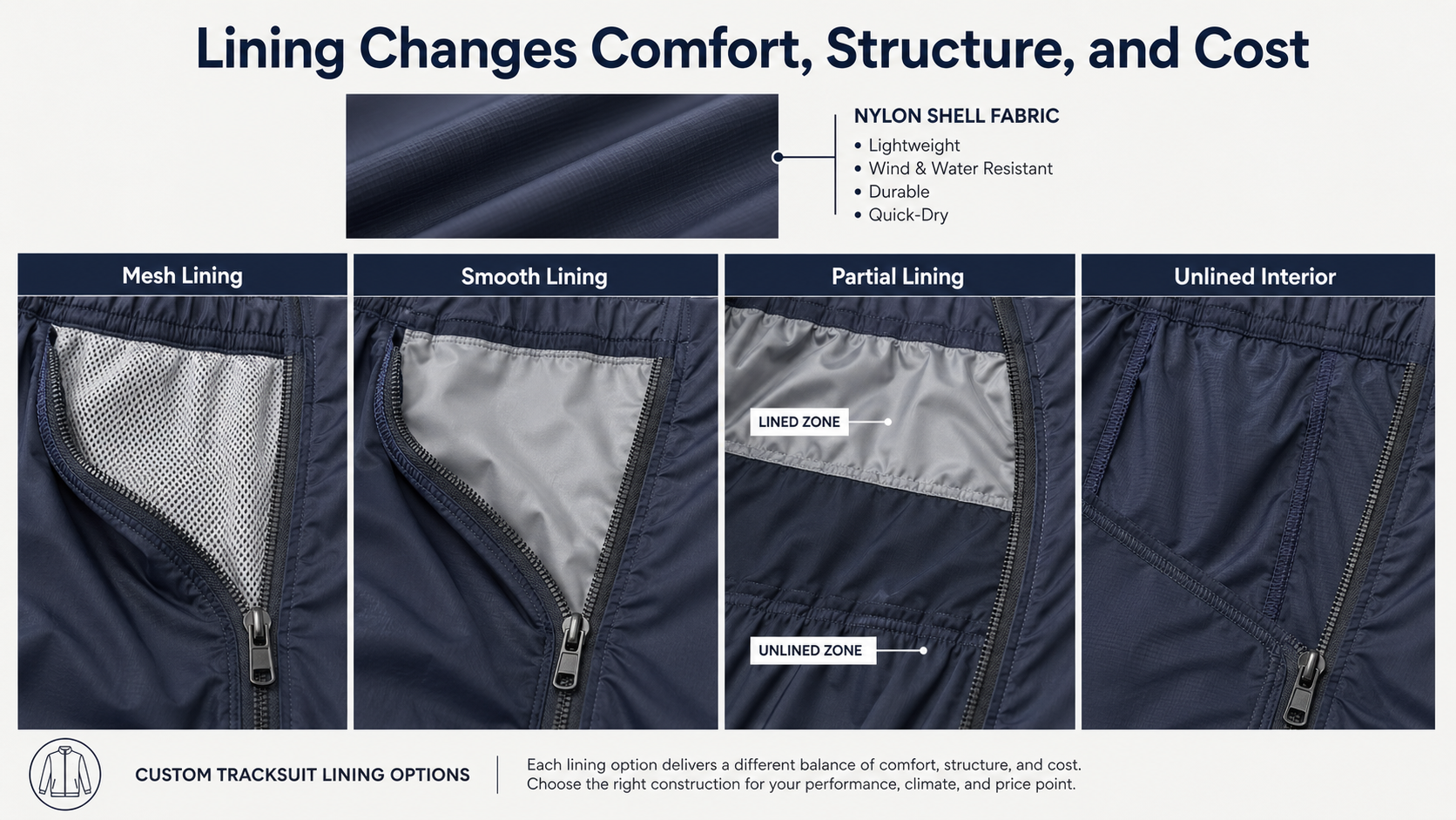 Lining changes the comfort, structure, warmth, and perceived quality of a nylon tracksuit. Buyers should decide lining early because it affects pattern, cost, sewing method, fit, and sample review.