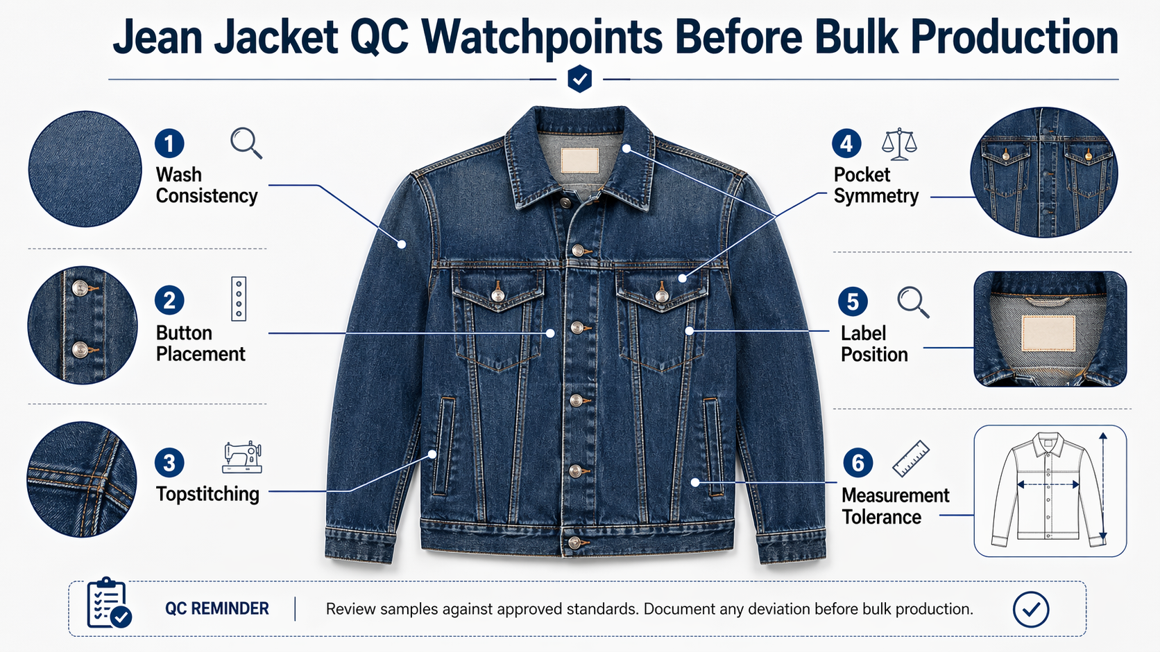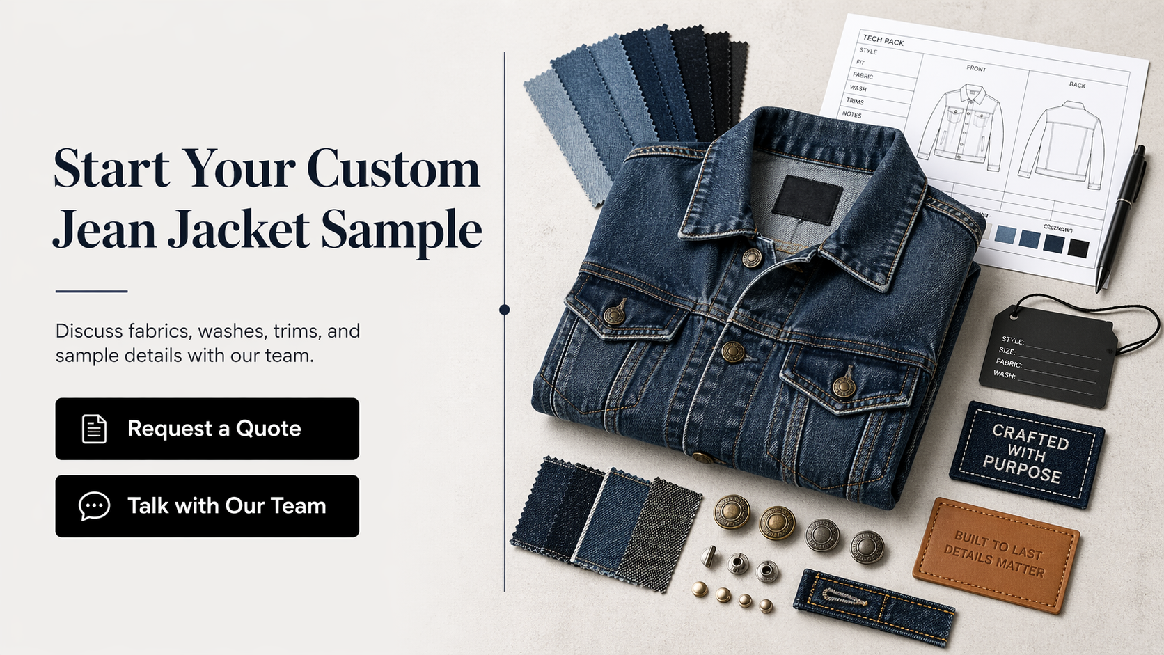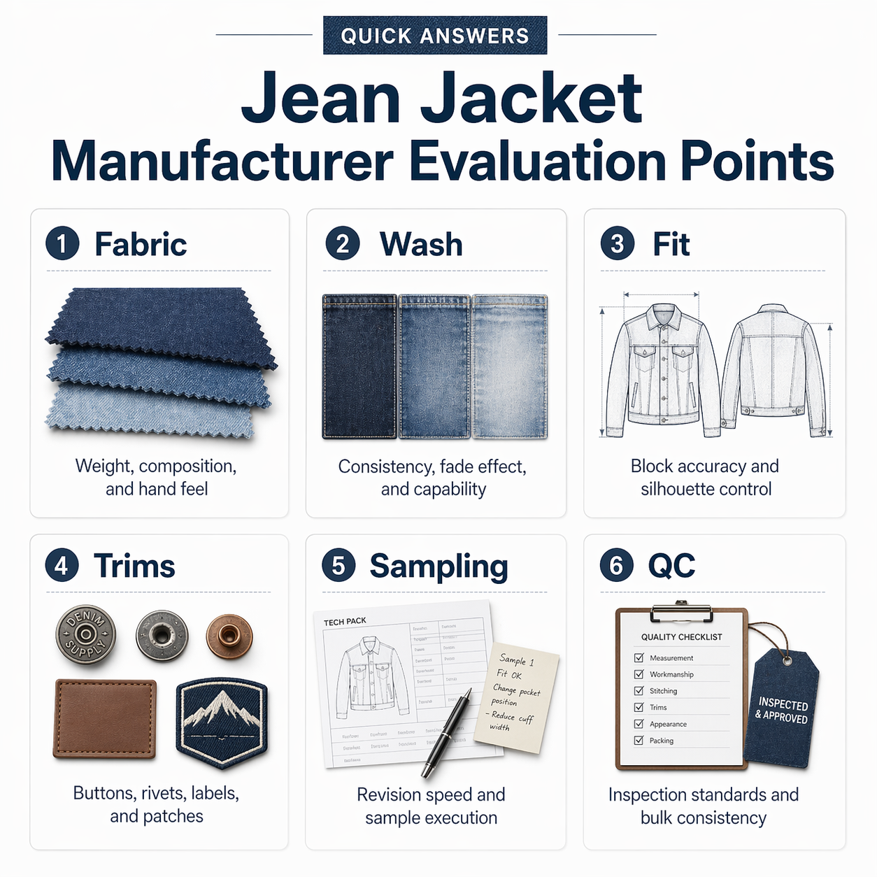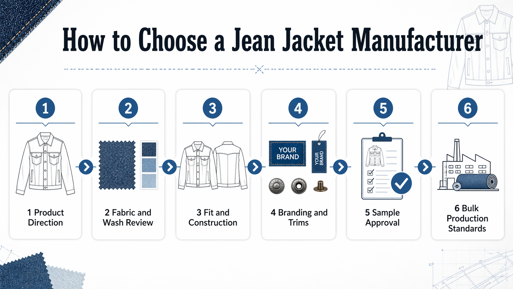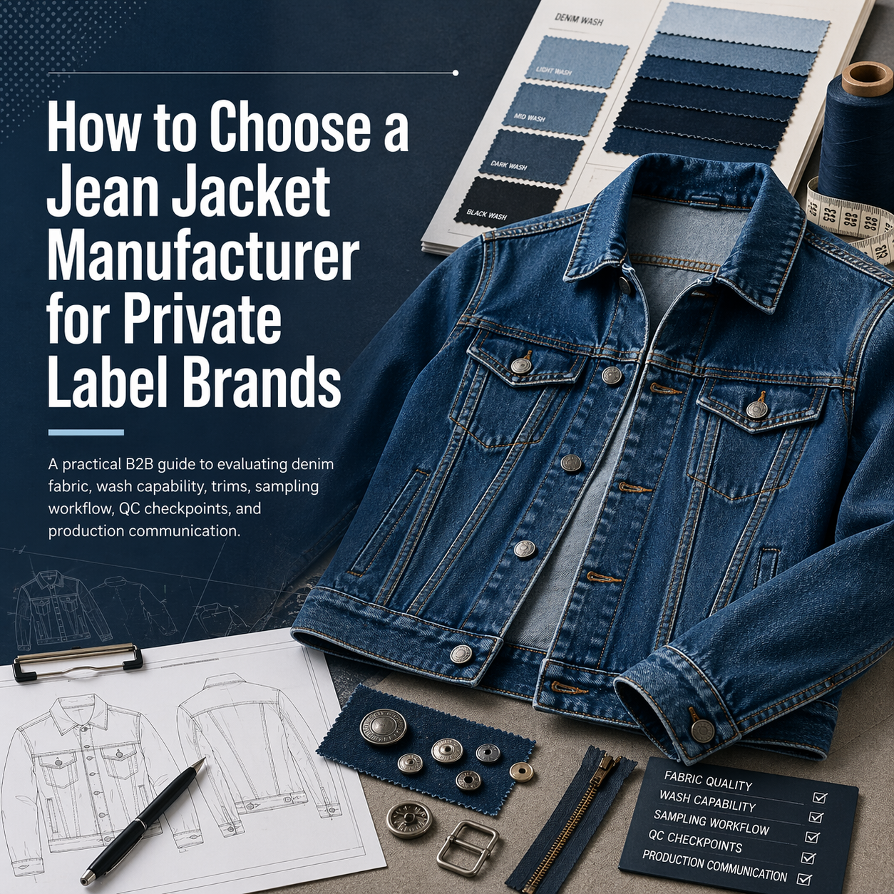 The first thing to check is whether the manufacturer understands denim fabric, wash development, fit control, trims, and sample approval. Jean jackets have denim-specific risks that general apparel suppliers may not manage well.