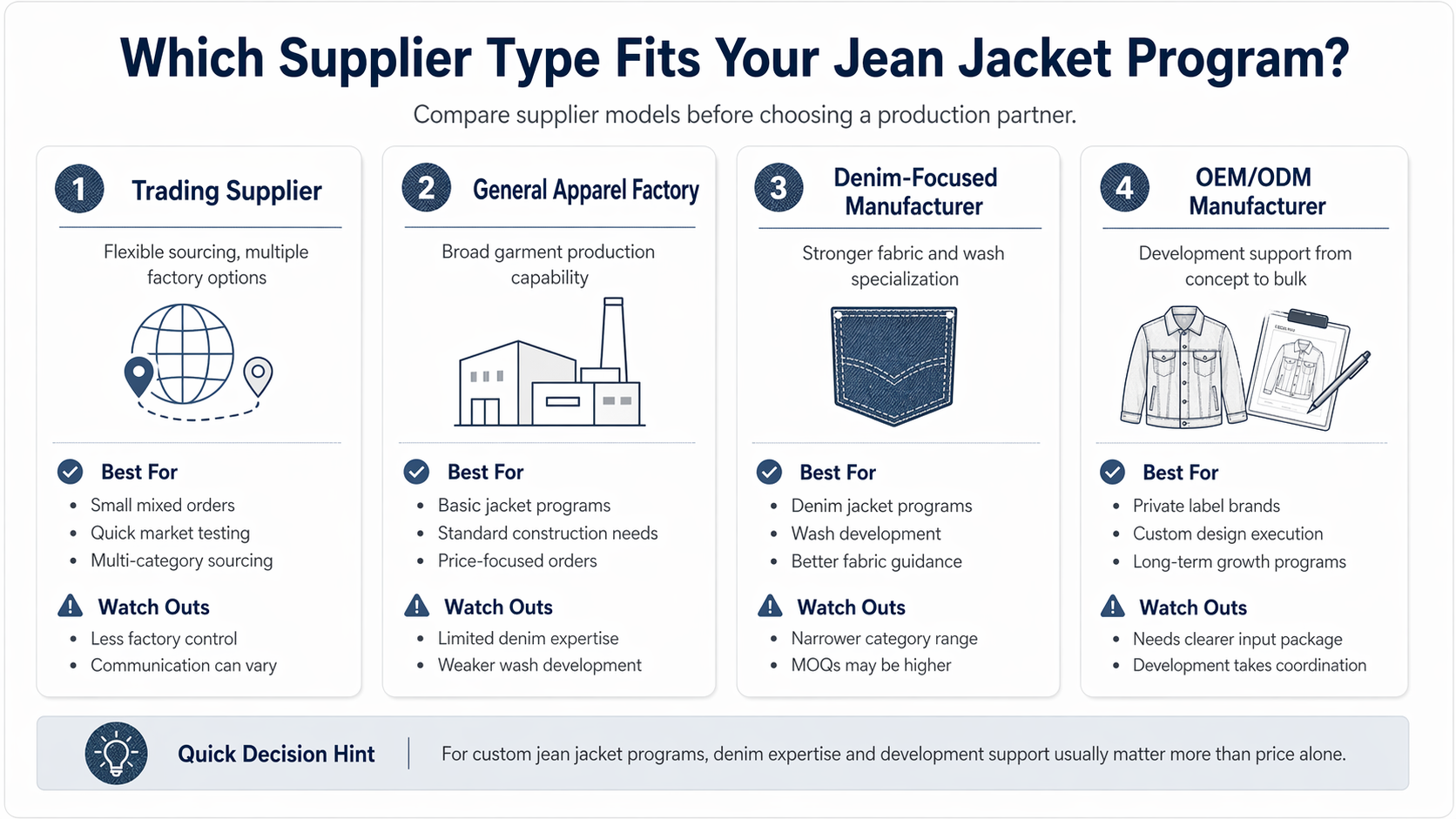 Not every supplier that offers denim products is suitable for private label jean jacket production. The right choice depends on how much development support your brand needs.