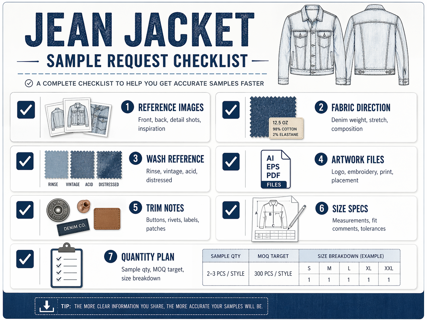 The next step is to prepare a clear jean jacket sample request. Start with the jacket type, fit direction, fabric preference, wash reference, trim requirements, artwork files, and target quantity. Then ask the manufacturer to review feasibility before you move into sampling.