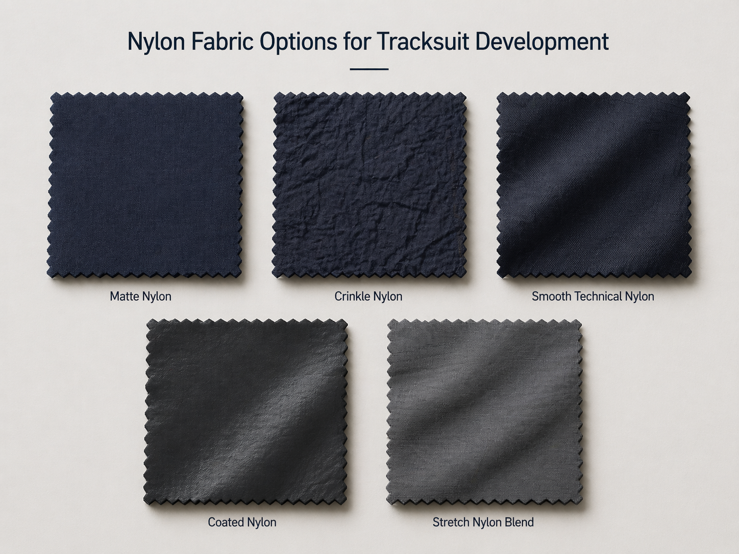 The best nylon fabric depends on the product direction. A lightweight sportswear set may need a smooth and breathable fabric, while a streetwear tracksuit may need more structure, texture, or visual impact. Buyers should confirm hand feel, weight, finish, lining, and intended use before sampling.