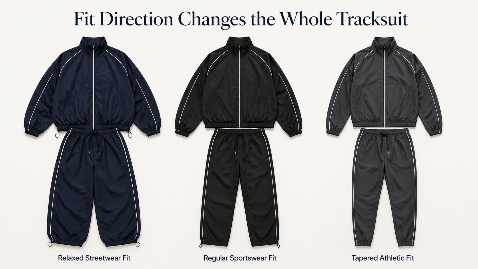 A tracksuit is a set, so the jacket and pants must feel balanced together. A strong jacket with weak pants can make the whole sample look incomplete. A loose jacket with narrow pants may work for some streetwear directions, but it should be intentional.