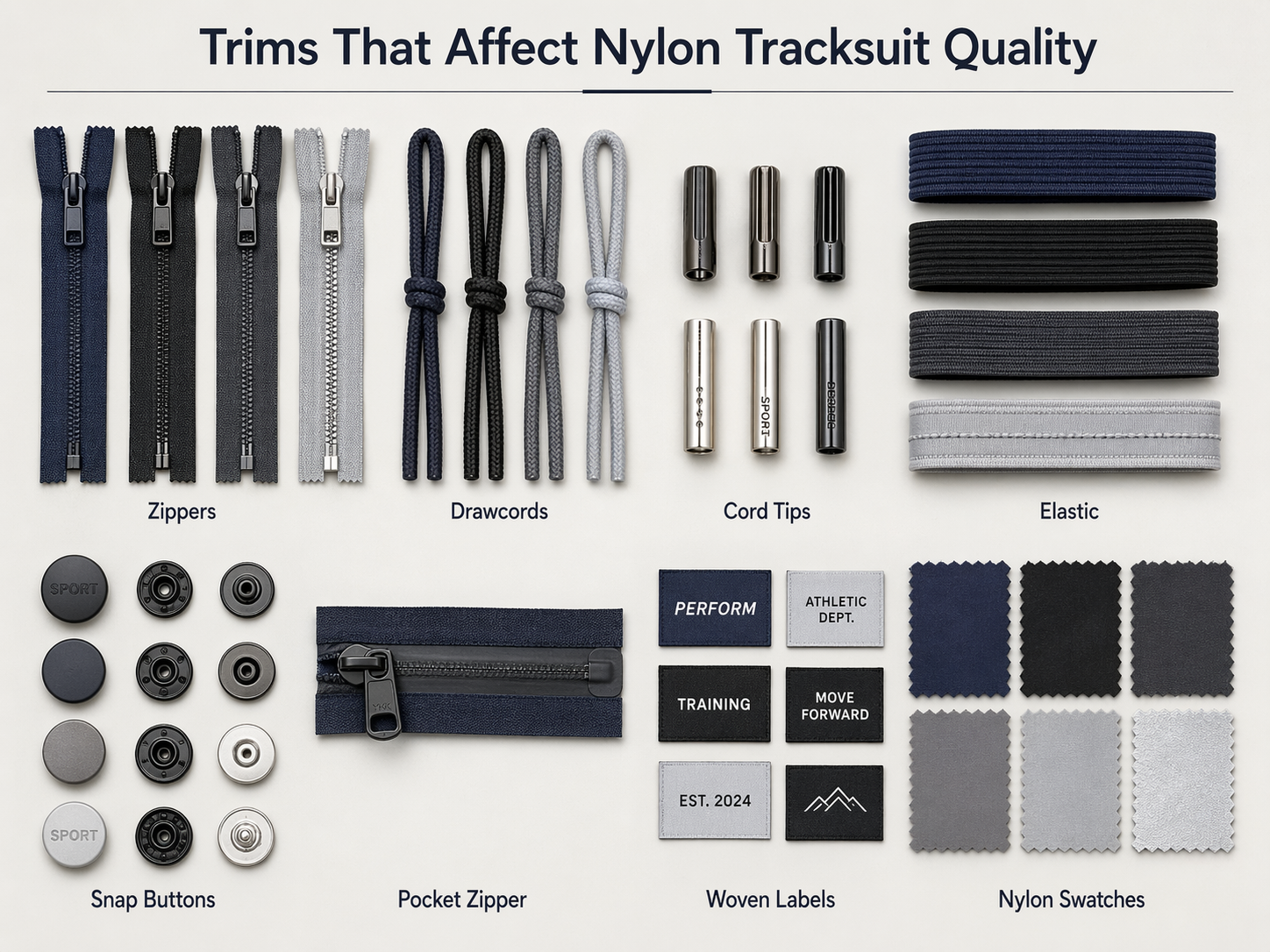 Trims can change the perceived quality and function of a nylon tracksuit. Even when the fabric is correct, weak zippers, loose elastic, poor drawcords, or unstable pocket construction can make the sample feel less reliable.