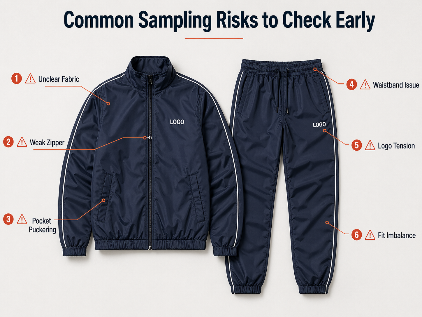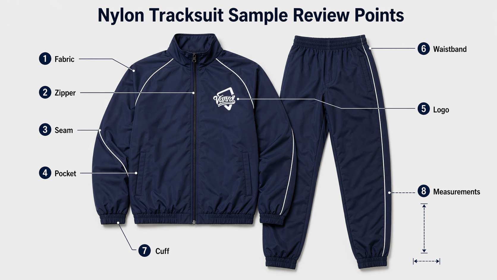 A sample should not be approved only because it looks close to the reference image. For a nylon tracksuit, the review should cover appearance, fit, construction, function, and production feasibility.