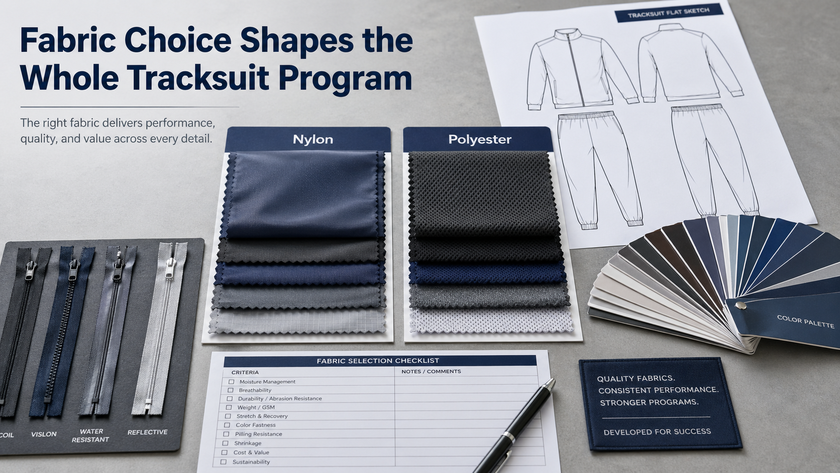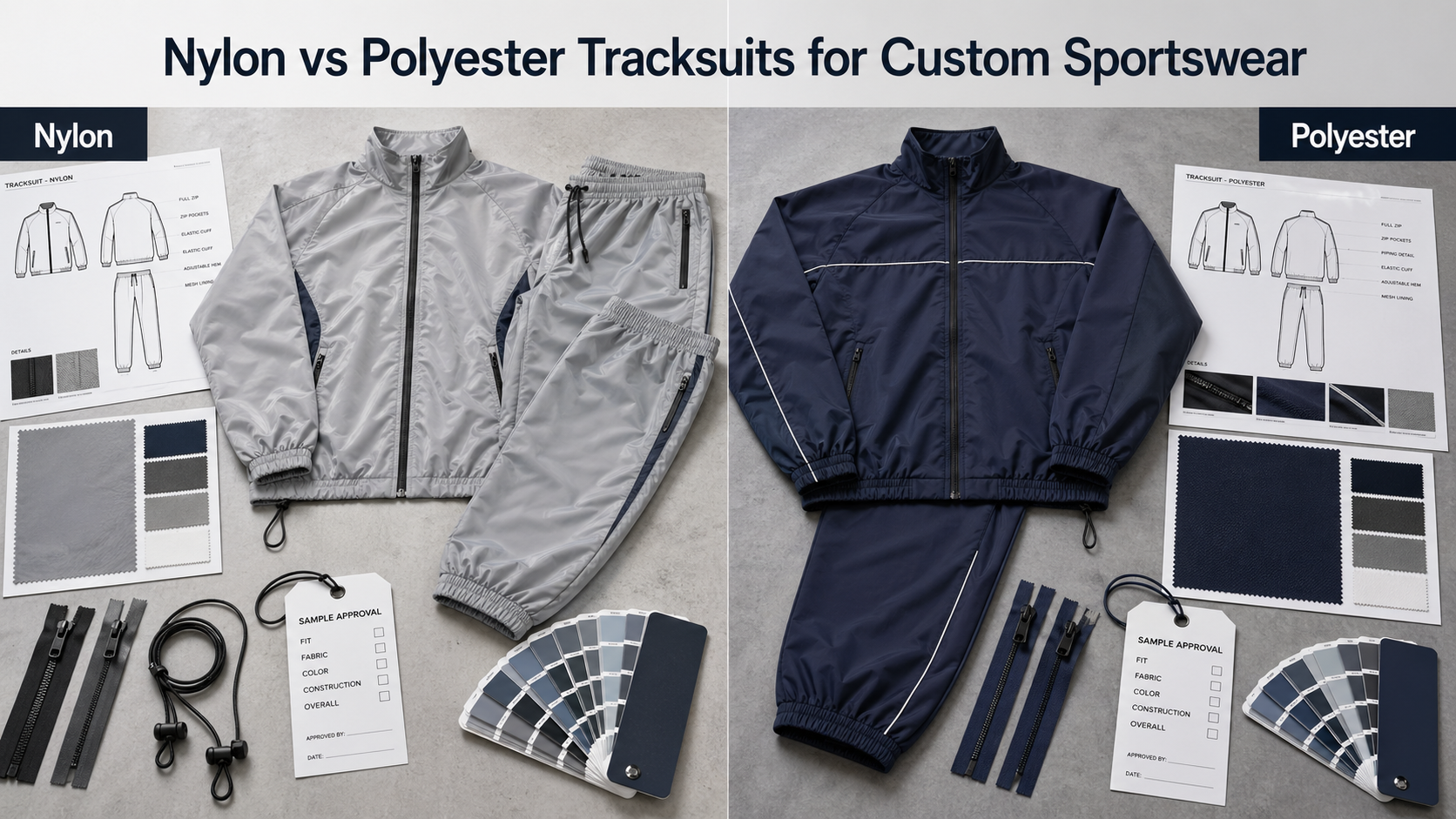 Fabric choice affects how a tracksuit looks, feels, performs, costs, and scales in production. For private label sportswear programs, nylon and polyester are not just material names. They are development directions that influence sampling, trim selection, branding methods, quality control, and final buyer perception.