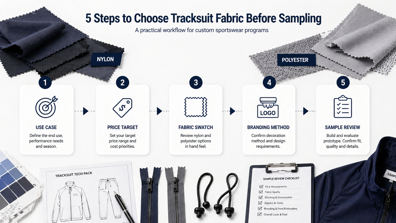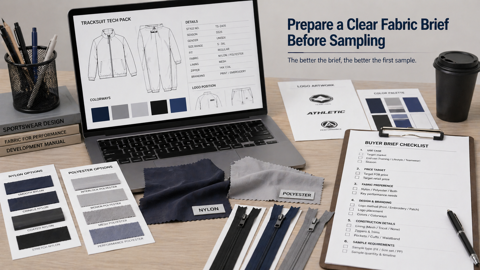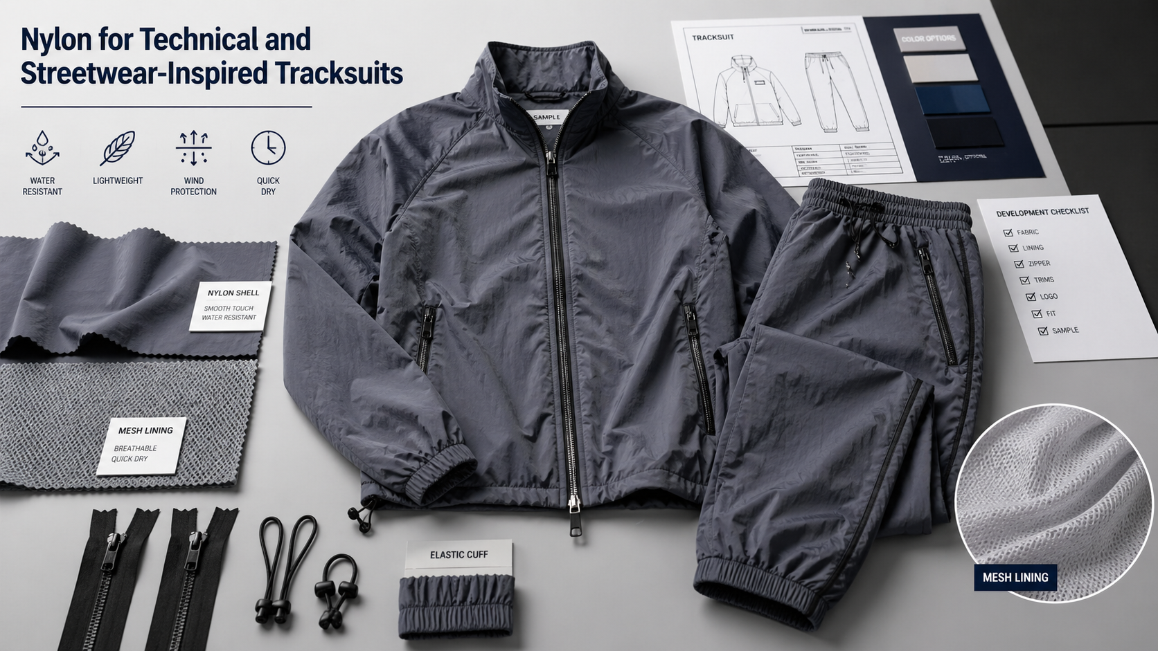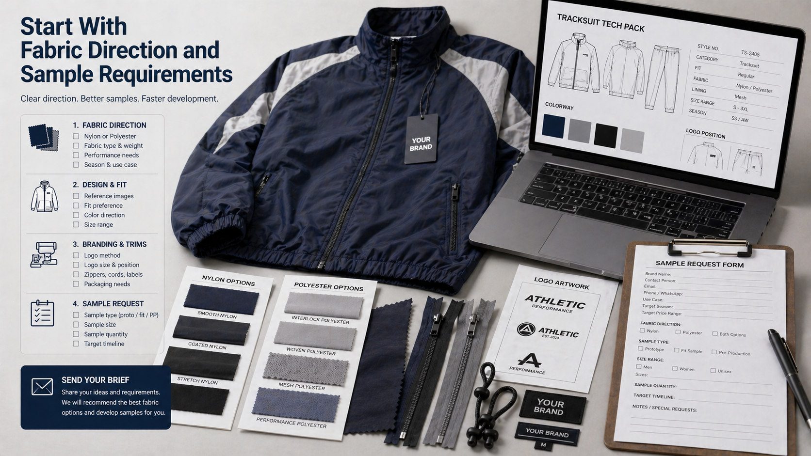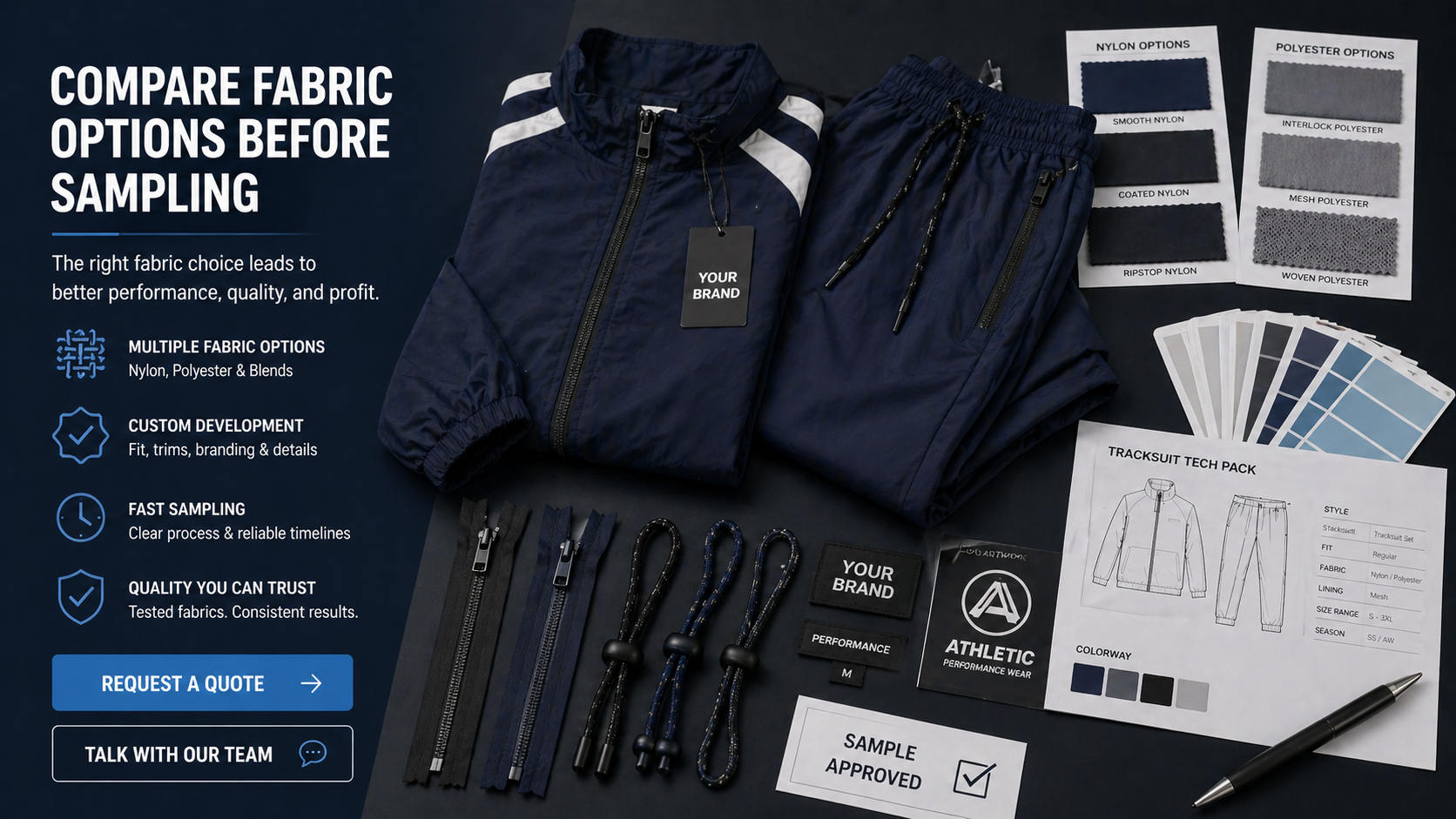 Before choosing nylon or polyester for a custom tracksuit program, prepare your product direction and compare real fabric options. The right decision should connect fabric behavior, target market, fit, branding, trims, and production planning.