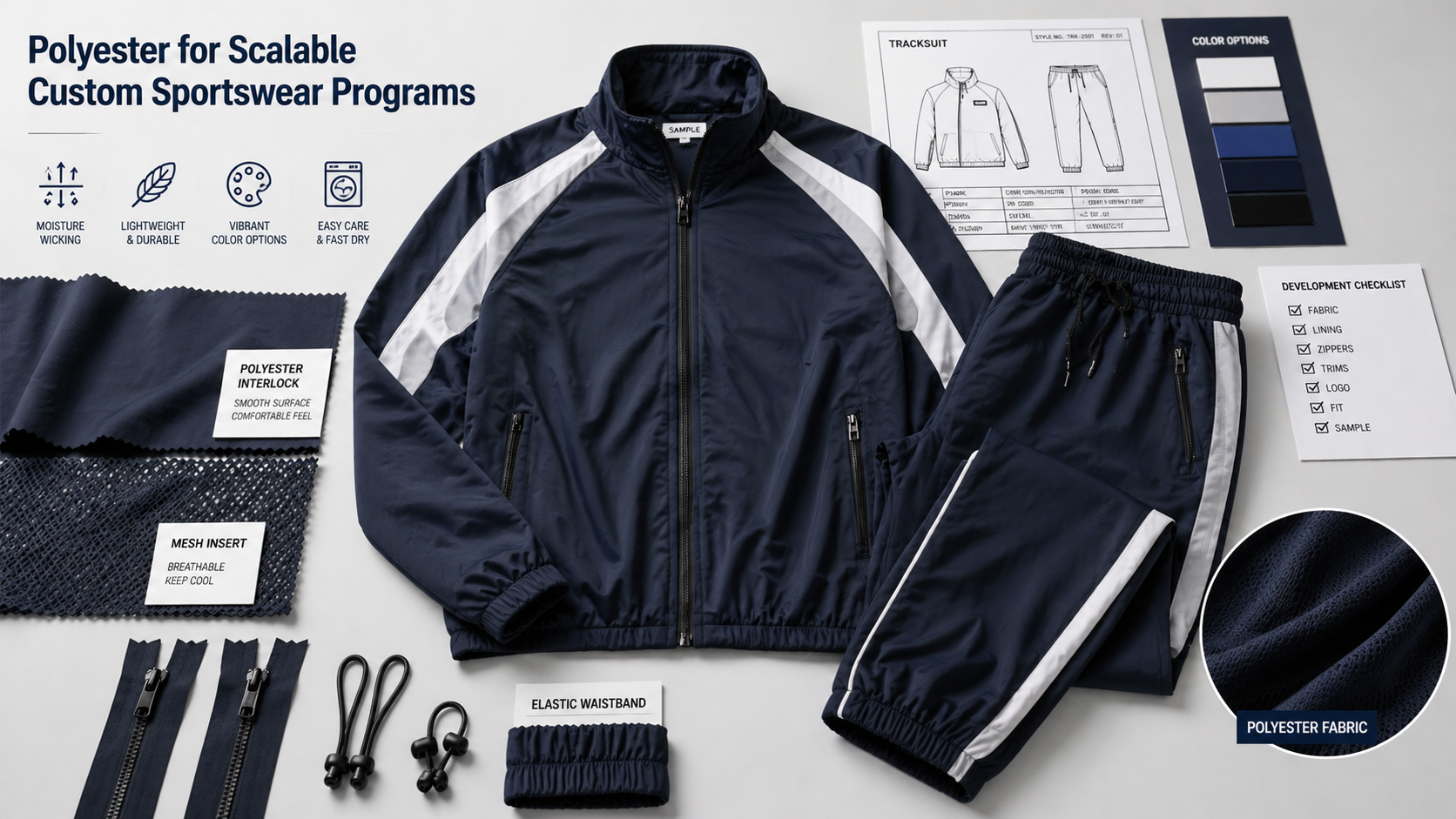 Polyester tracksuits are often suitable when the brand needs practical performance, stable sourcing, broader color options, and better cost control. Polyester is widely used in sportswear because it can support many fabric structures, including woven, knit, mesh, interlock, and performance finishes.