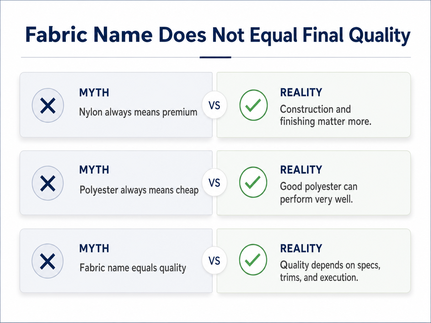 A common misunderstanding is that nylon automatically means premium and polyester automatically means cheap. This is not accurate in manufacturing.