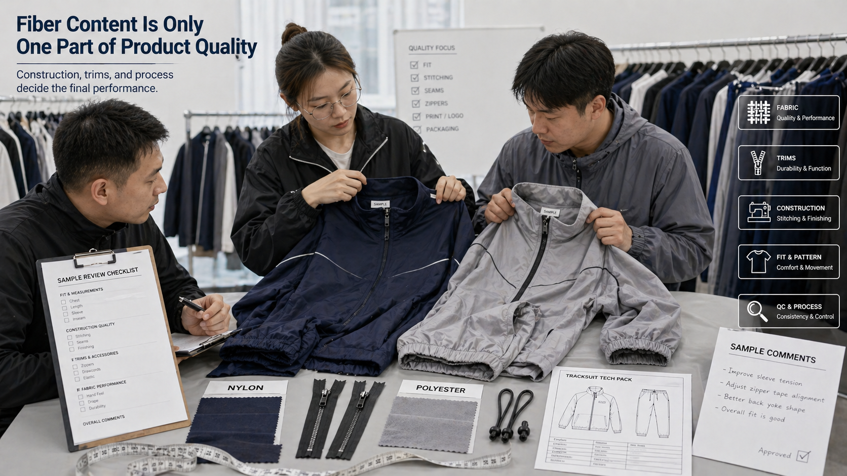In factory development, fiber content is only one part of the tracksuit decision. Two polyester fabrics can feel very different. Two nylon fabrics can also behave differently in sewing, lining, logo application, and bulk production.