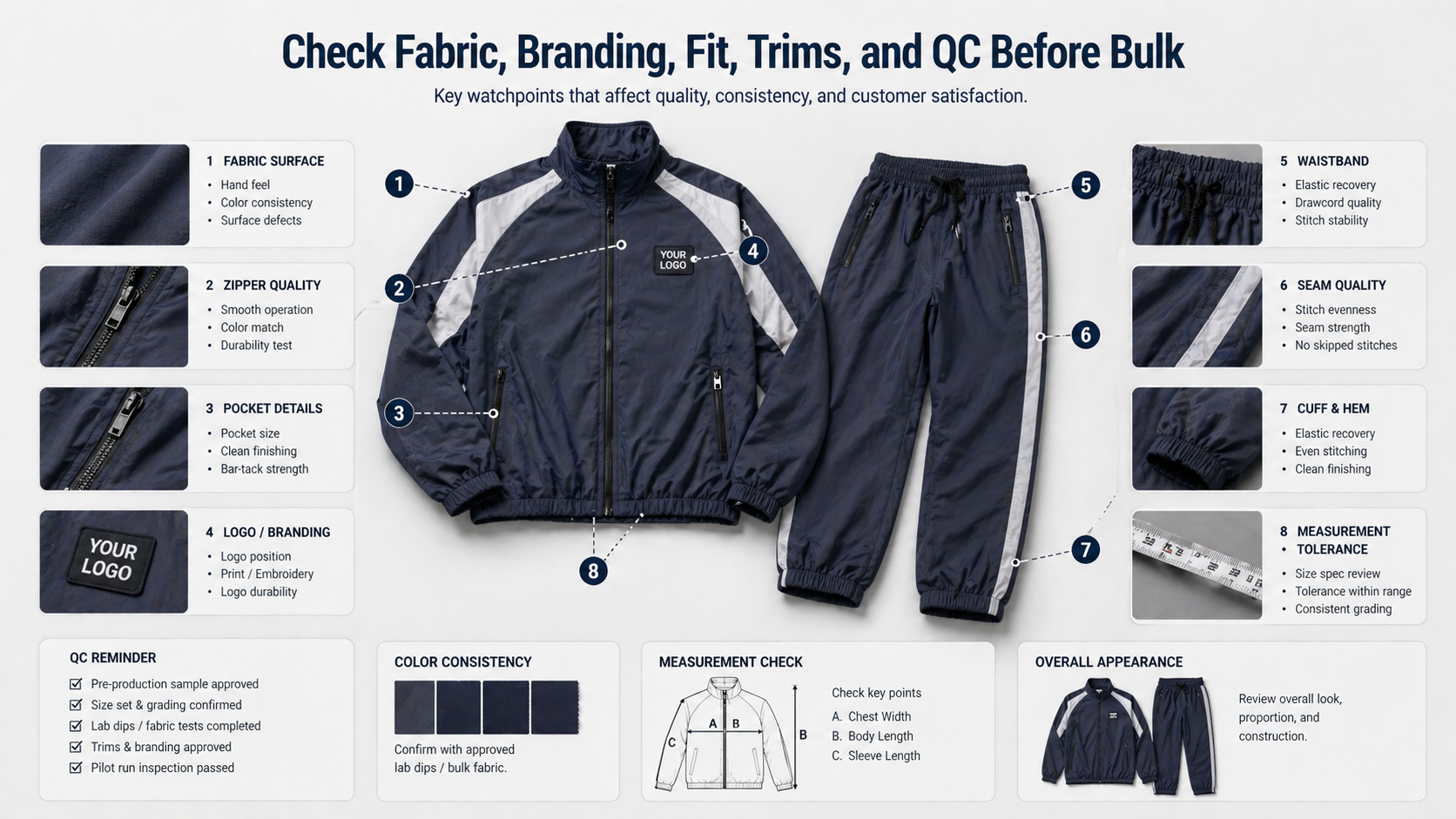 A sample may look correct, but bulk production still requires confirmed fabric sourcing, color standard, measurement tolerance, and inspection requirements.