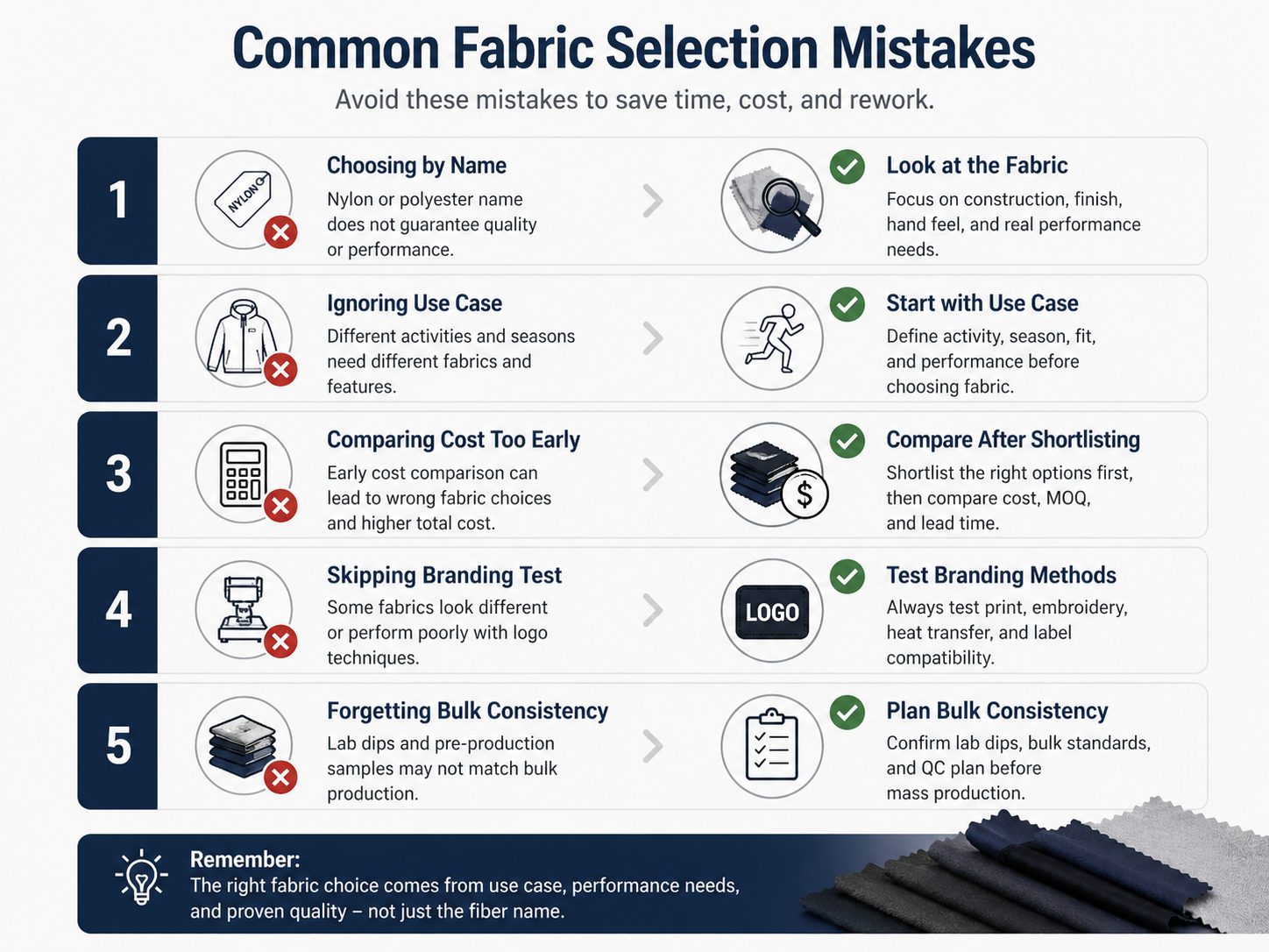 Many fabric selection problems come from comparing nylon and polyester too generally. Buyers should avoid these mistakes before sampling.