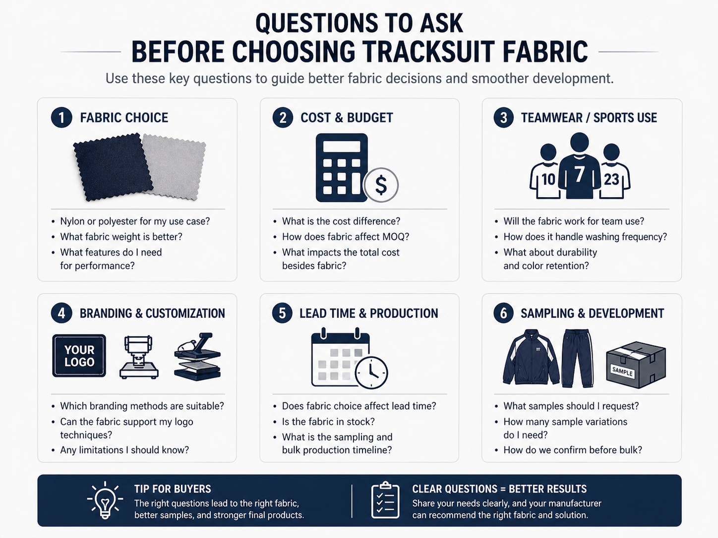 A manufacturer can give better fabric advice when the buyer provides enough project context. Instead of asking only for "nylon tracksuit" or "polyester tracksuit," the buyer should explain the expected product direction.