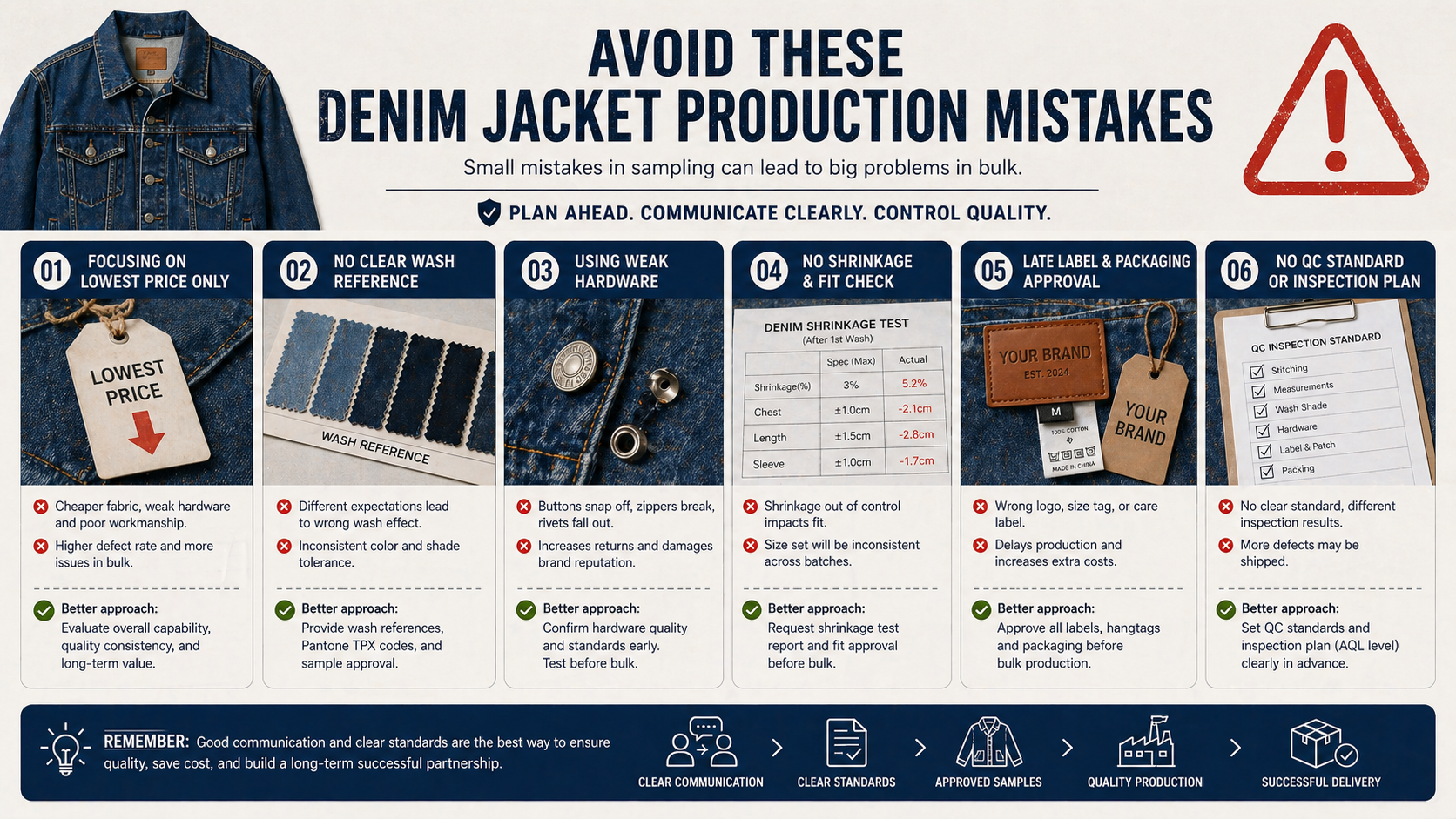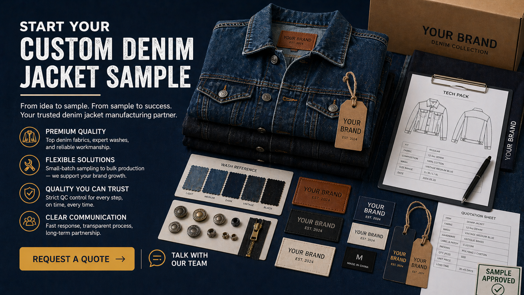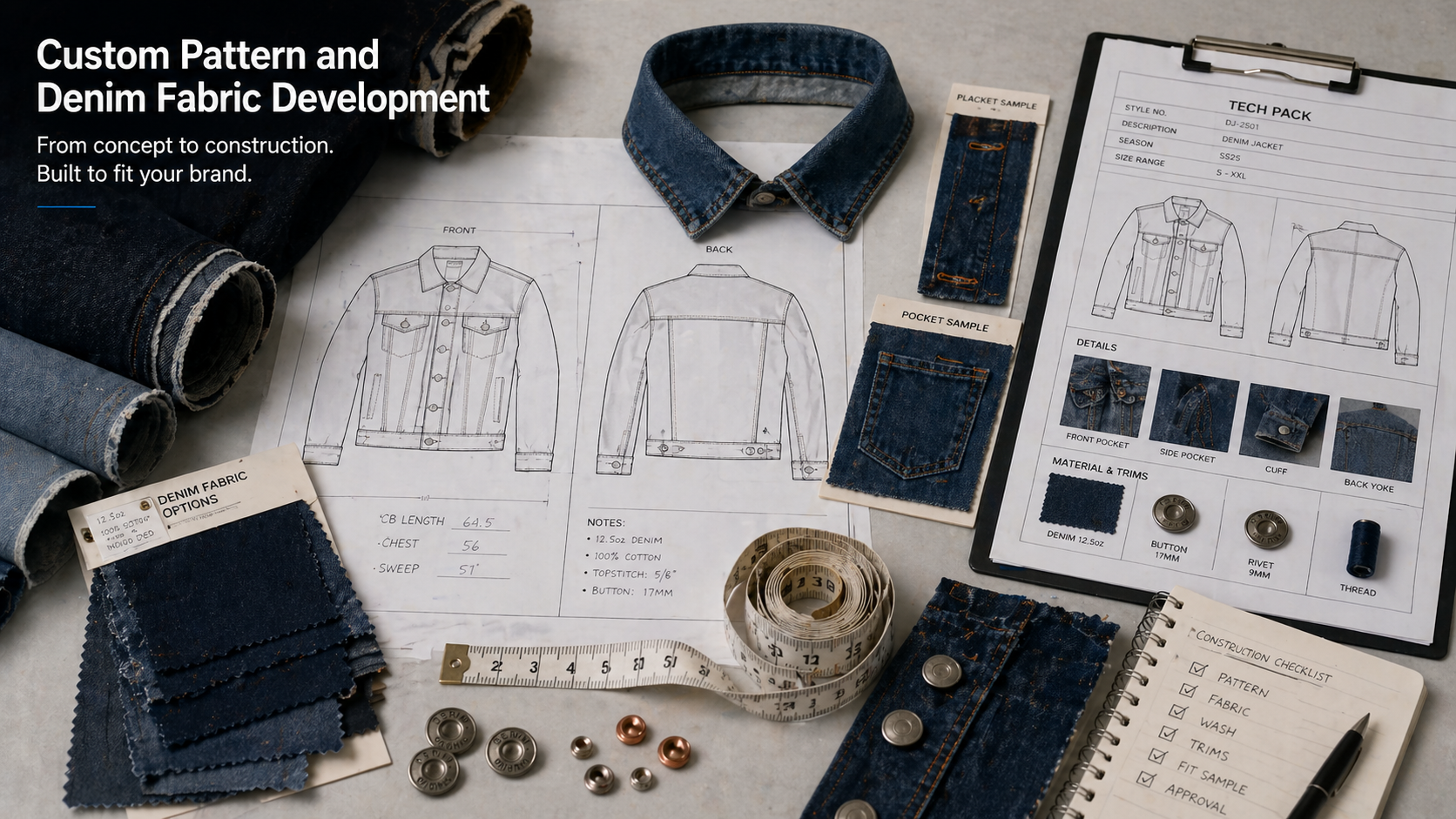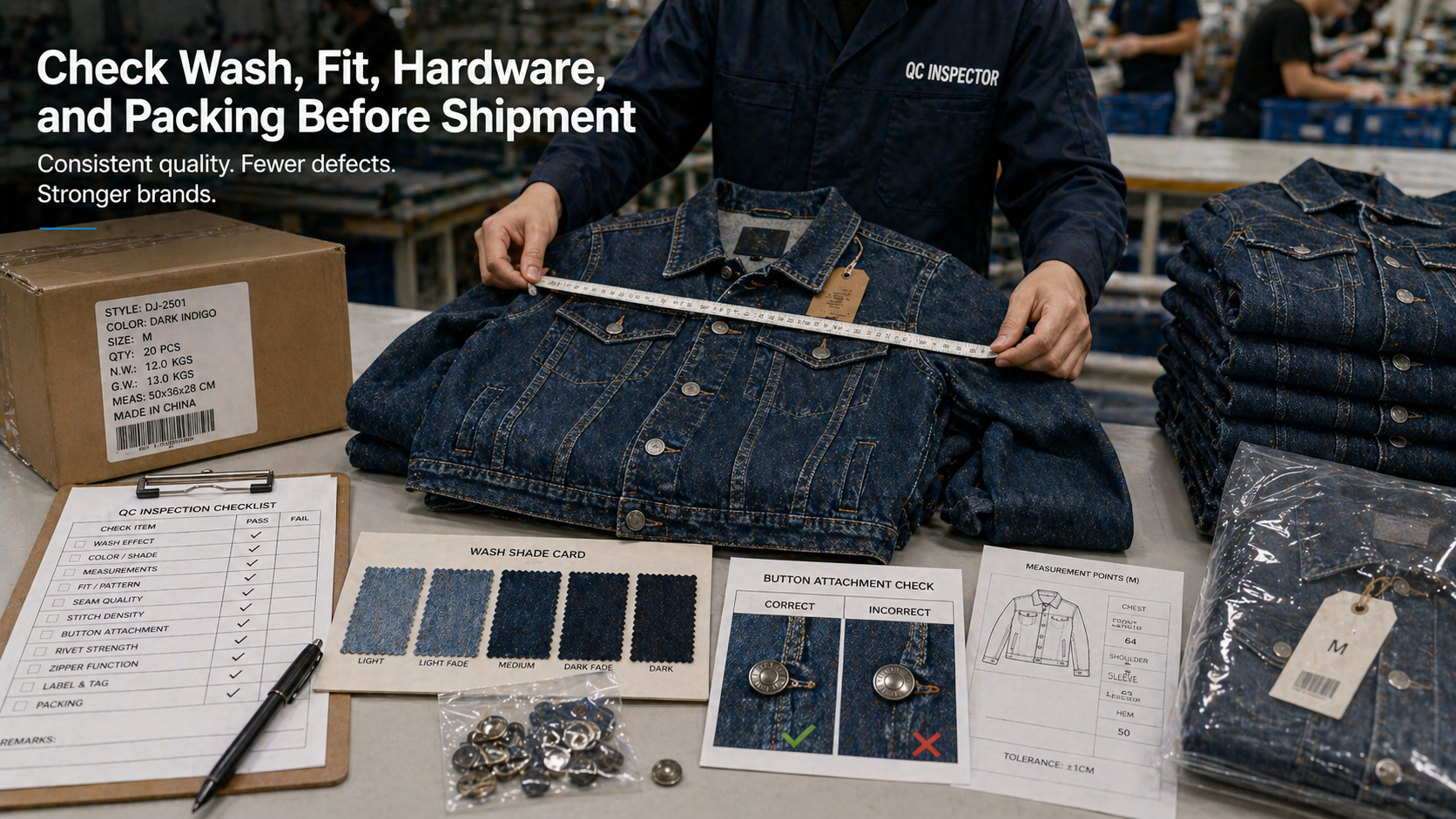Before bulk production, brands should approve denim fabric, wash shade, fit, measurements, hardware, button and rivet placement, logo method, patch placement, labels, packaging, and QC standards.