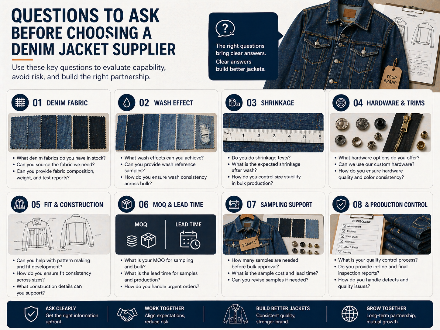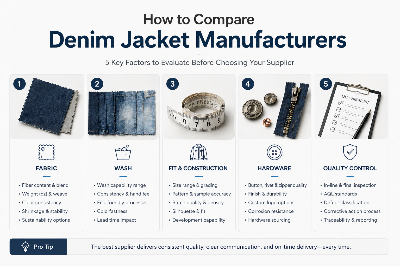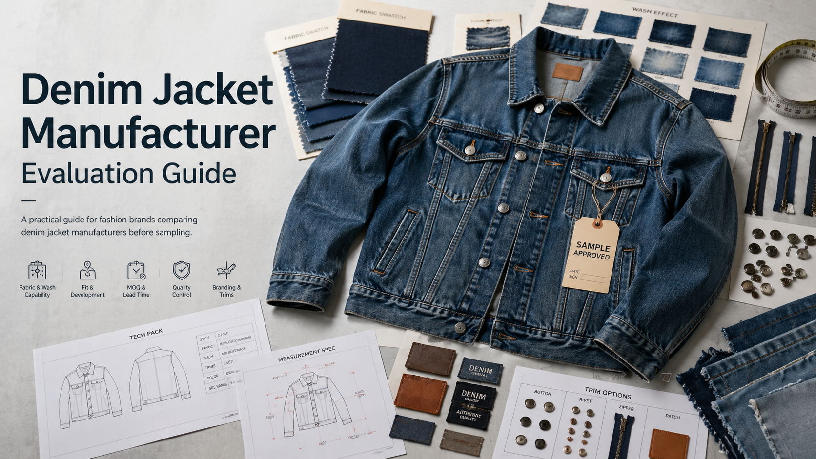 The right denim jacket manufacturer depends on fabric sourcing, wash development, fit control, trim selection, branding method, production workflow, and QC standards. Fashion brands should compare suppliers by denim jacket capability, not only by price or sample photos. A strong manufacturer should help confirm fabric weight, wash effect, shrinkage, measurements, hardware, logo placement, and bulk inspection points before production.