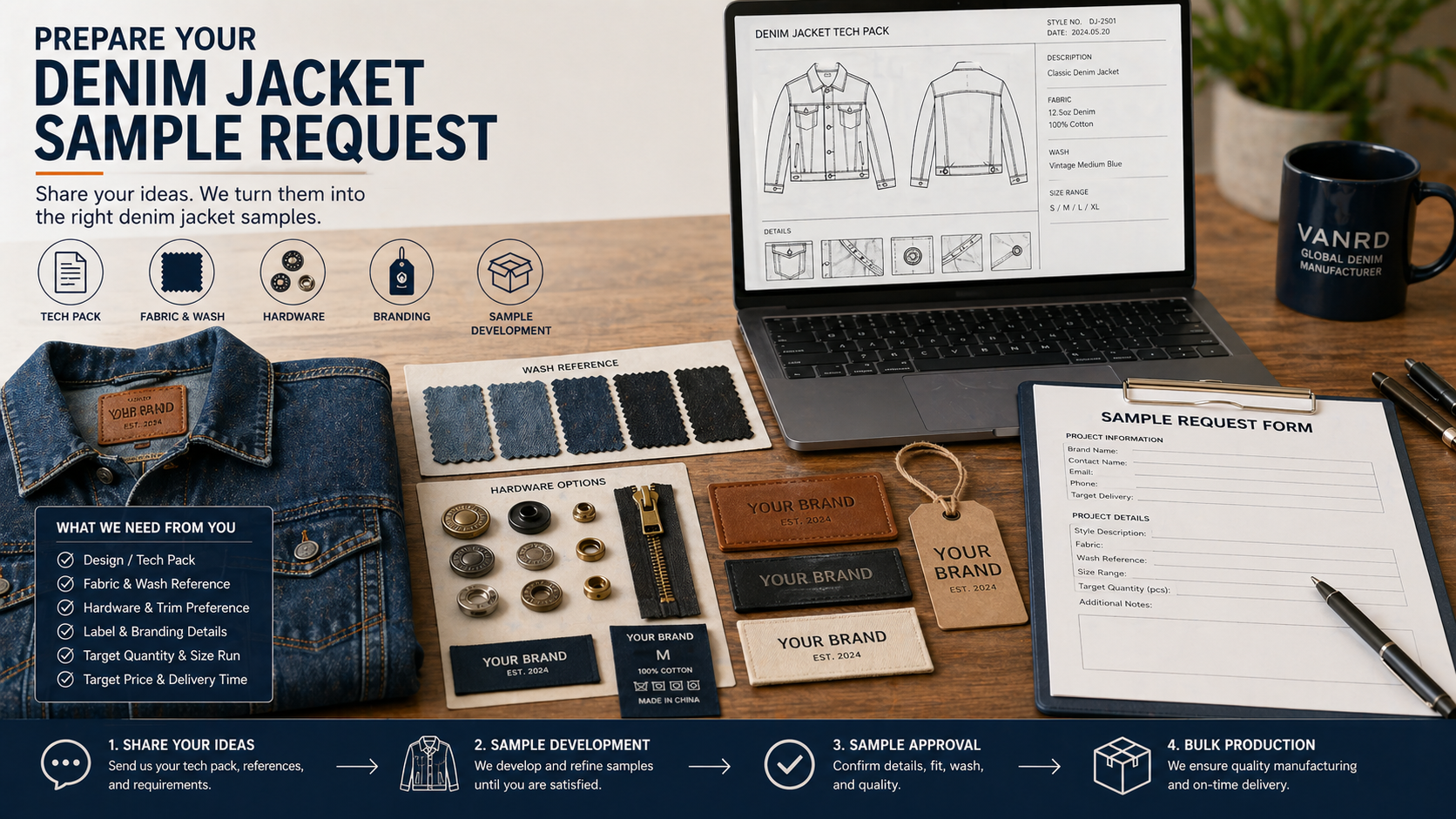 Vanrd works with private label and fashion buyers that need OEM/ODM development, denim jacket sampling, fabric and trim coordination, wash direction discussion, bulk production, and quality control. If your brand is comparing denim jacket manufacturer options, you can send your product brief, reference images, and development requirements for review.