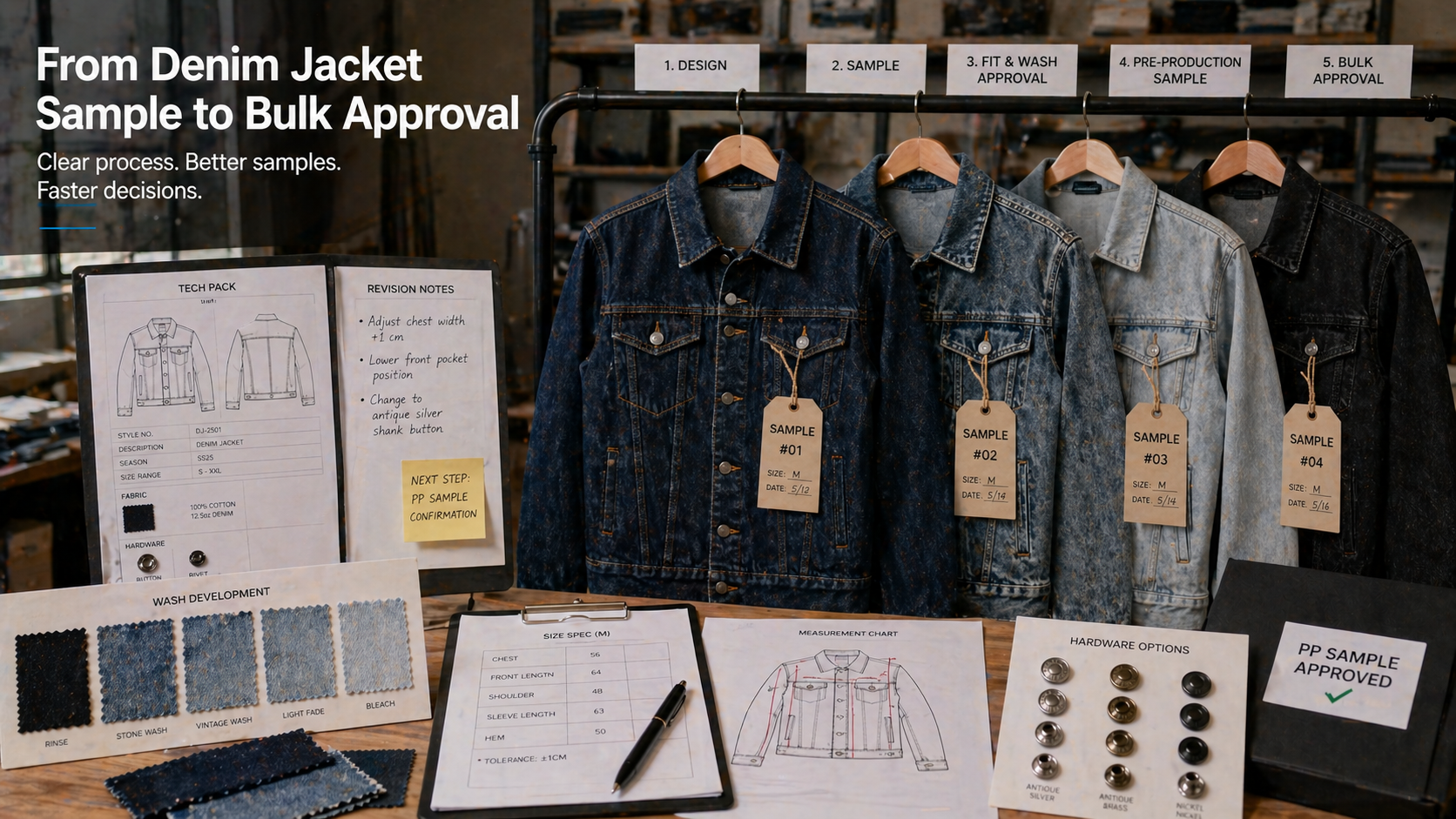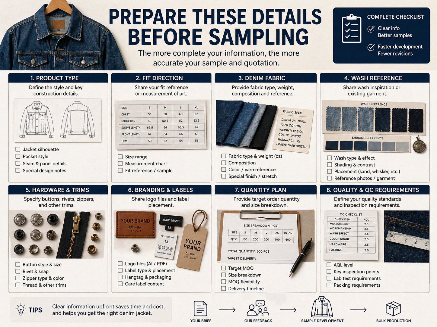 Brands should prepare reference images, tech pack if available, size chart, denim fabric direction, wash references, logo artwork, button or hardware requirements, label details, target quantity, and QC expectations. If some details are not final, they should be clearly marked for factory recommendation.