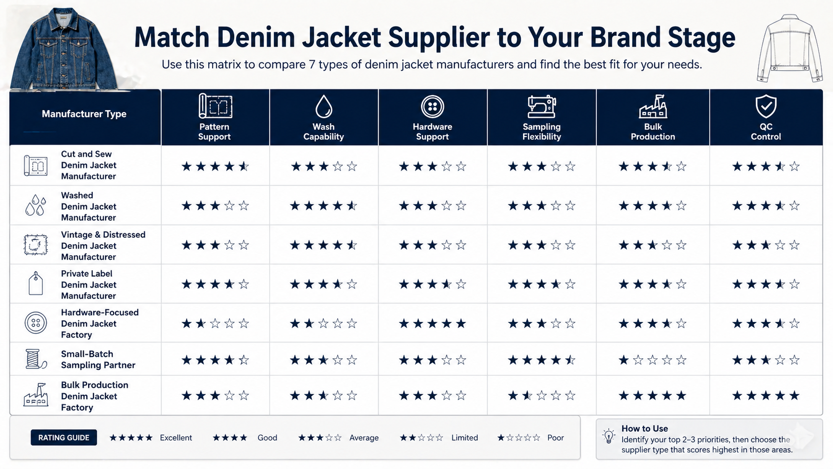 A "Top 7 denim jacket manufacturers" article can be misleading if it ranks factories without verified production data, factory audits, buyer feedback, or comparable denim category evidence. For fashion brands, the more practical question is not "Who is number one?" but "Which type of denim jacket manufacturer fits this project?"