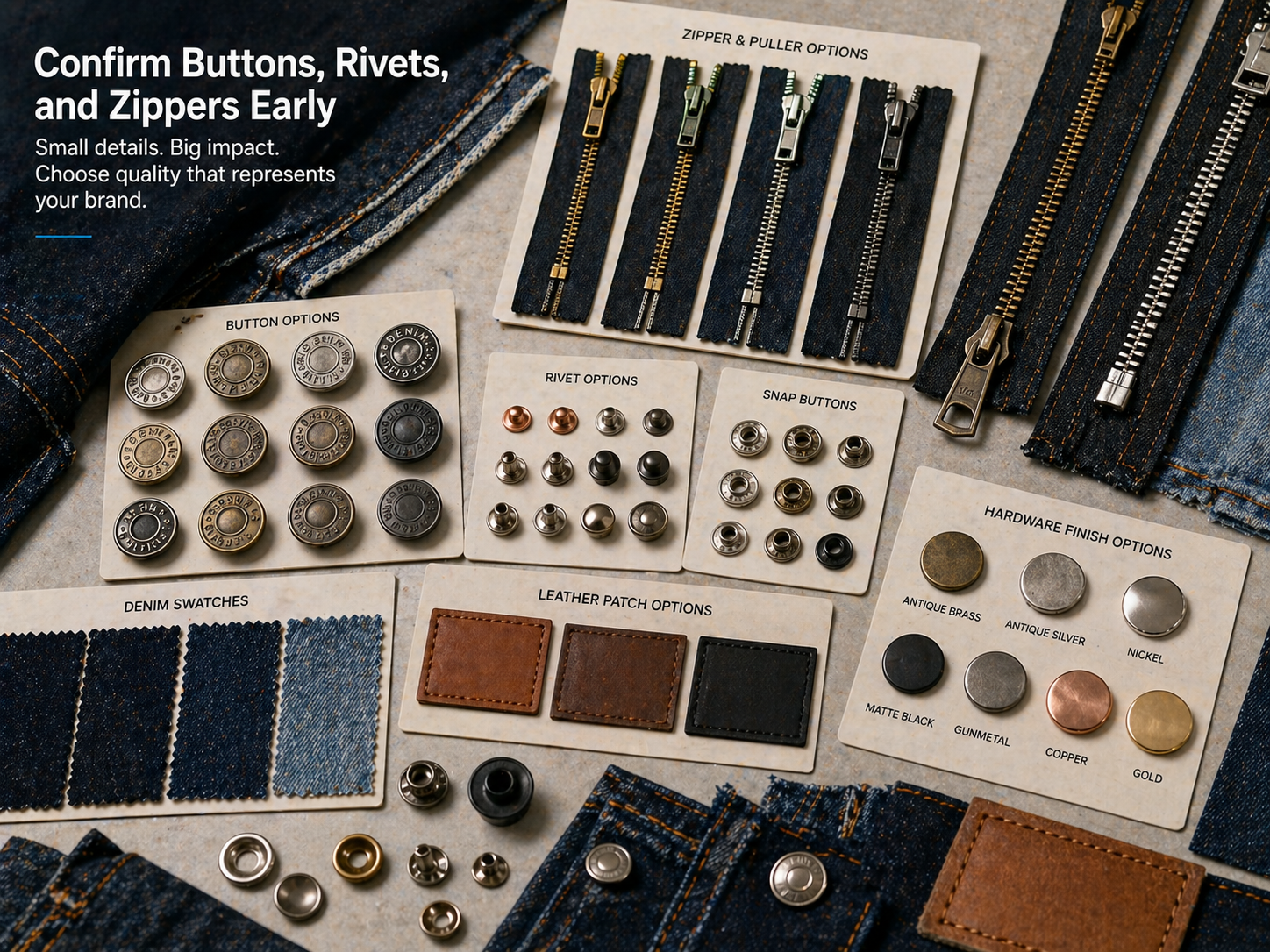 Buttons, rivets, zippers, snaps, and patches should be approved before bulk production. Late hardware changes can affect sampling, cost, and production planning.