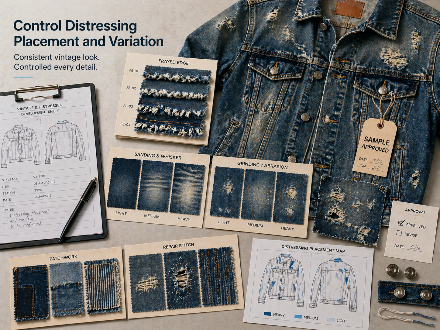 Washed denim jacket production should not start with vague instructions such as "make it vintage." Brands should provide reference photos, target shade, fabric type, wash direction, distressing placement, and acceptable variation range.