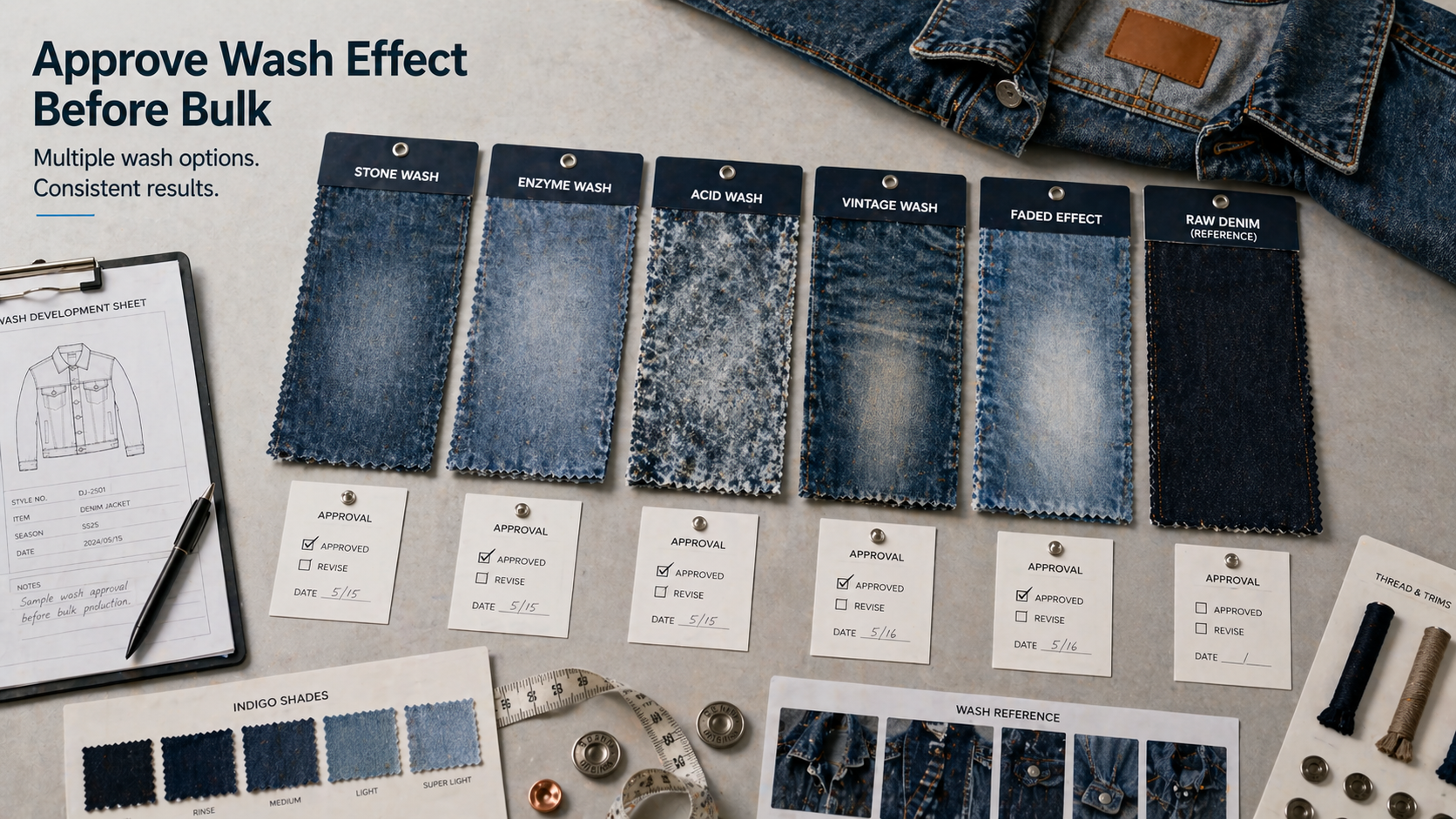 Wash control is important because washing can change color, hand feel, shrinkage, measurements, and surface effect. Without an approved wash standard, bulk denim jackets may not match the sample closely enough.
