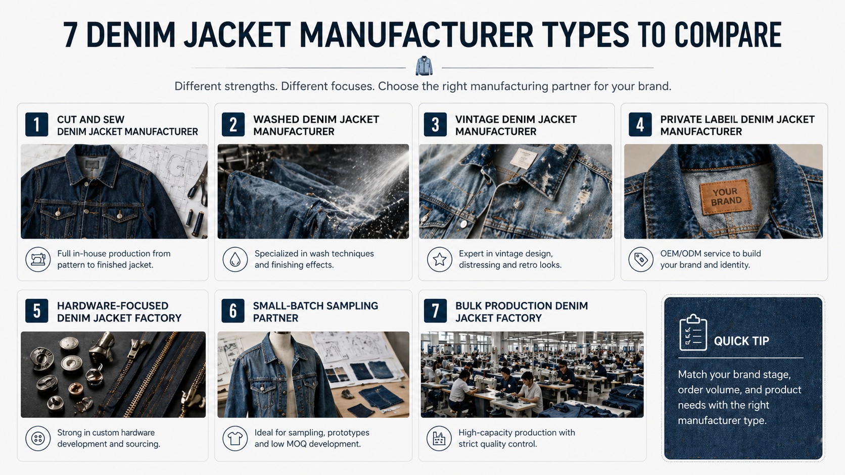 This guide explains 7 types of denim jacket manufacturers fashion brands should compare before sampling. It is designed to help buyers shortlist the right supplier based on product stage, fabric needs, wash complexity, trims, MOQ planning, and QC expectations.