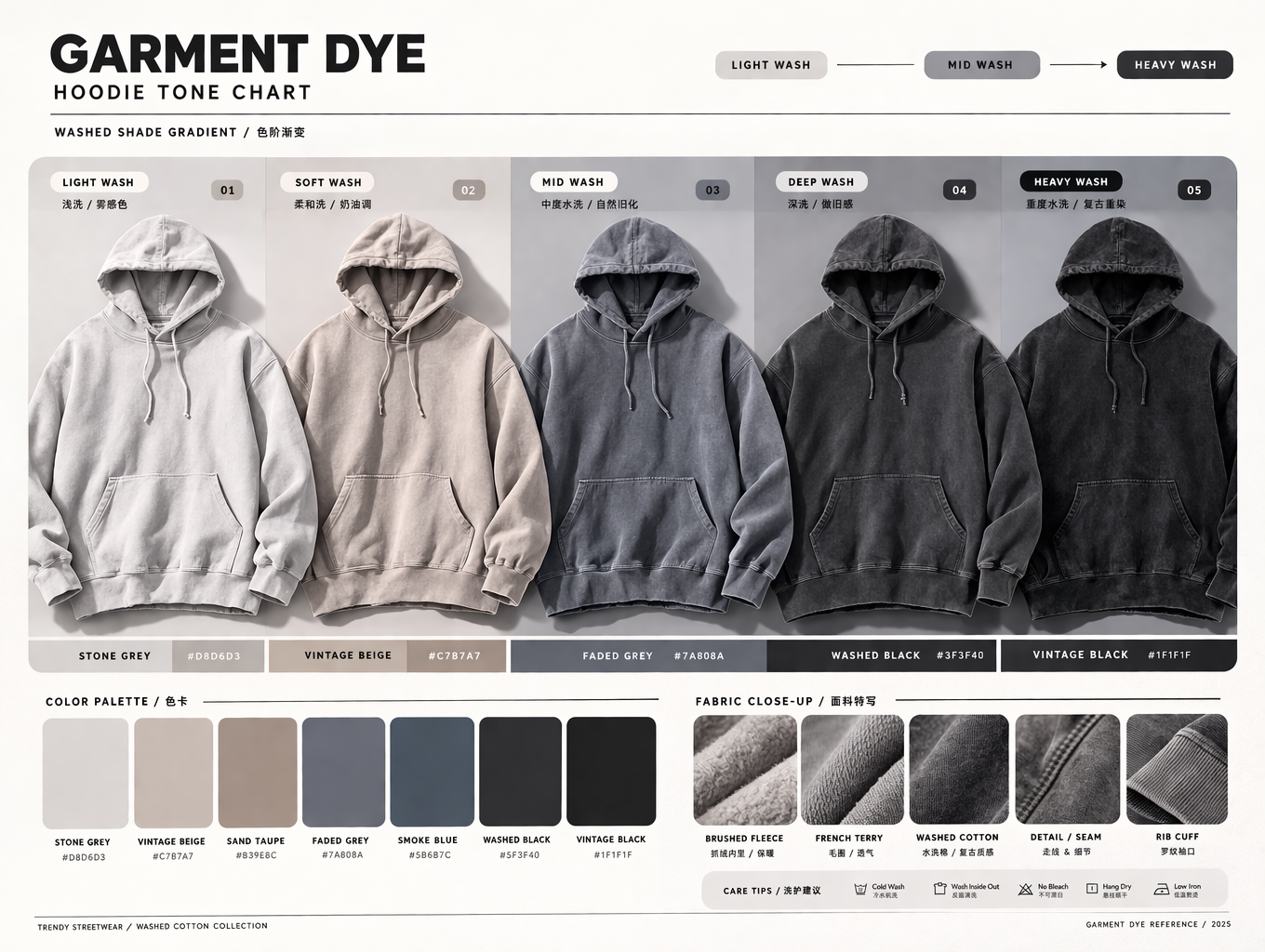 Color is one of the first things buyers read as "vintage." A hoodie can look more vintage when the color feels muted, washed down, sun-faded, dusty, or uneven in a controlled way.