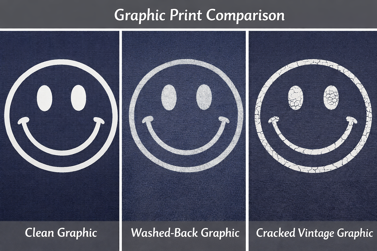 Graphic effect | Crisp and new-looking | Cracked, faded, distressed, or aged-looking when relevant |