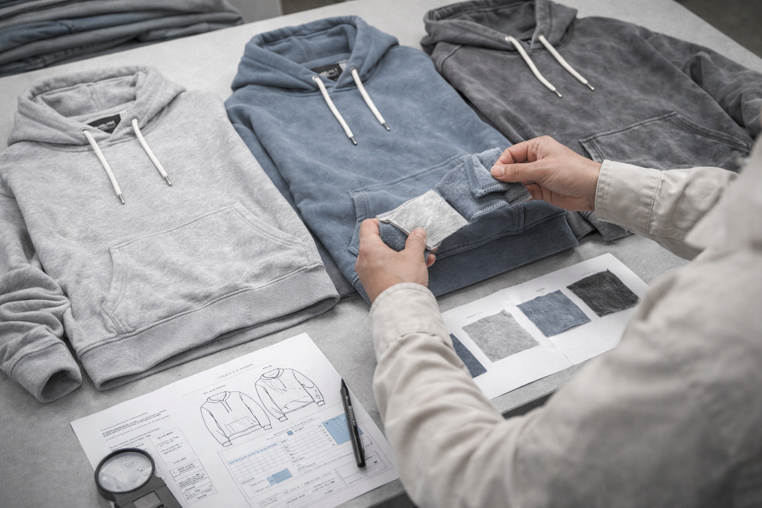 "Vintage" can mean faded, sun-washed, heavy, distressed, heritage, washed black, cracked graphic, boxy fit, or several things at once. A vague brief creates vague sampling. | Vintage effects often look different in edited campaign images than in real sample review conditions. Physical review or consistent review standards matter more than a single styled photo. | If the garment will be washed aggressively, size balance and tolerance need attention. Otherwise, the final look may be good while the fit becomes unstable. | An aged hoodie print often needs to be developed with the wash direction in mind. If not, the print may stay too sharp or degrade in the wrong way. | Trying to combine aggressive wash, complex print aging, oversized fit, heavy rib, and multiple trim changes in one early sample can slow approvals and make problem diagnosis harder. |