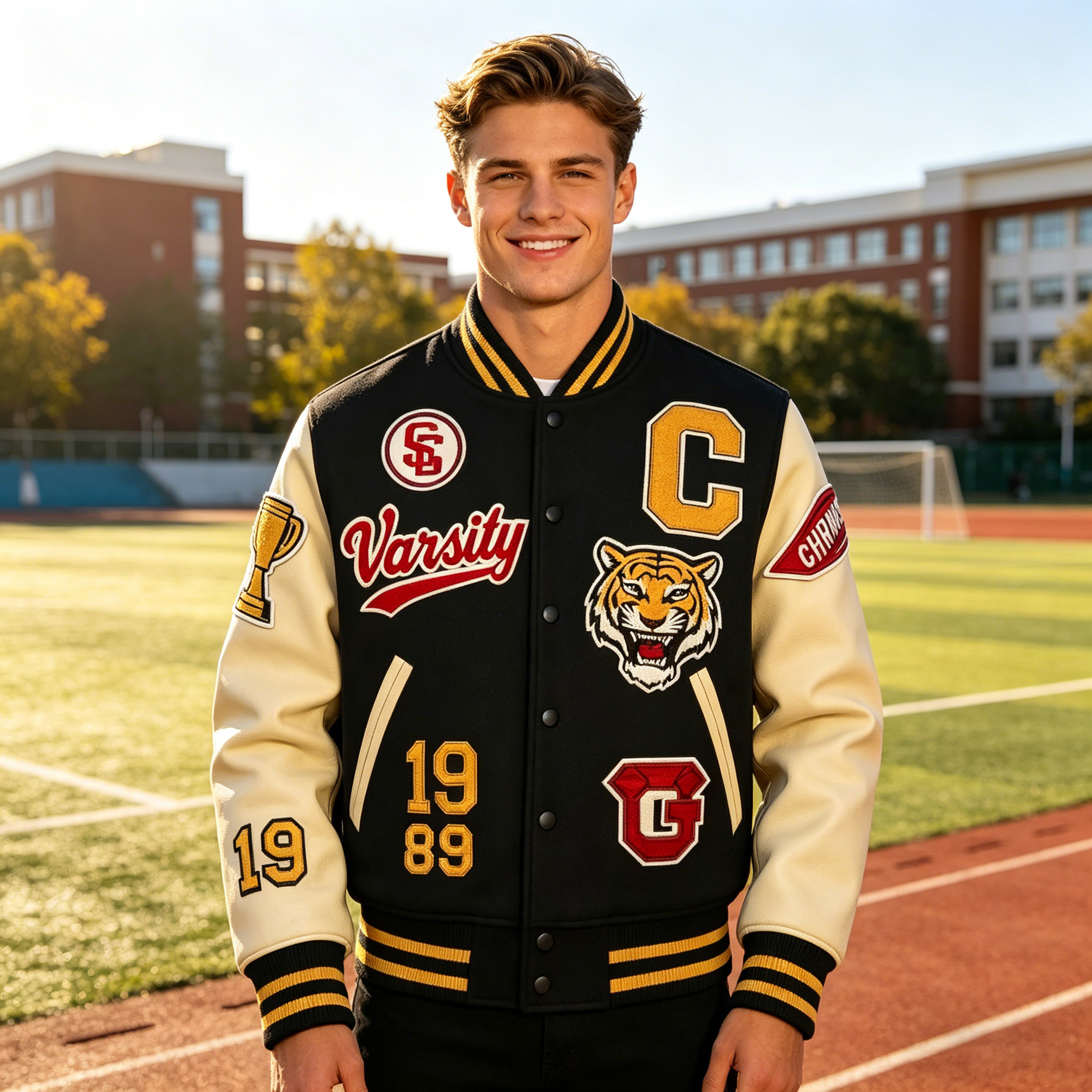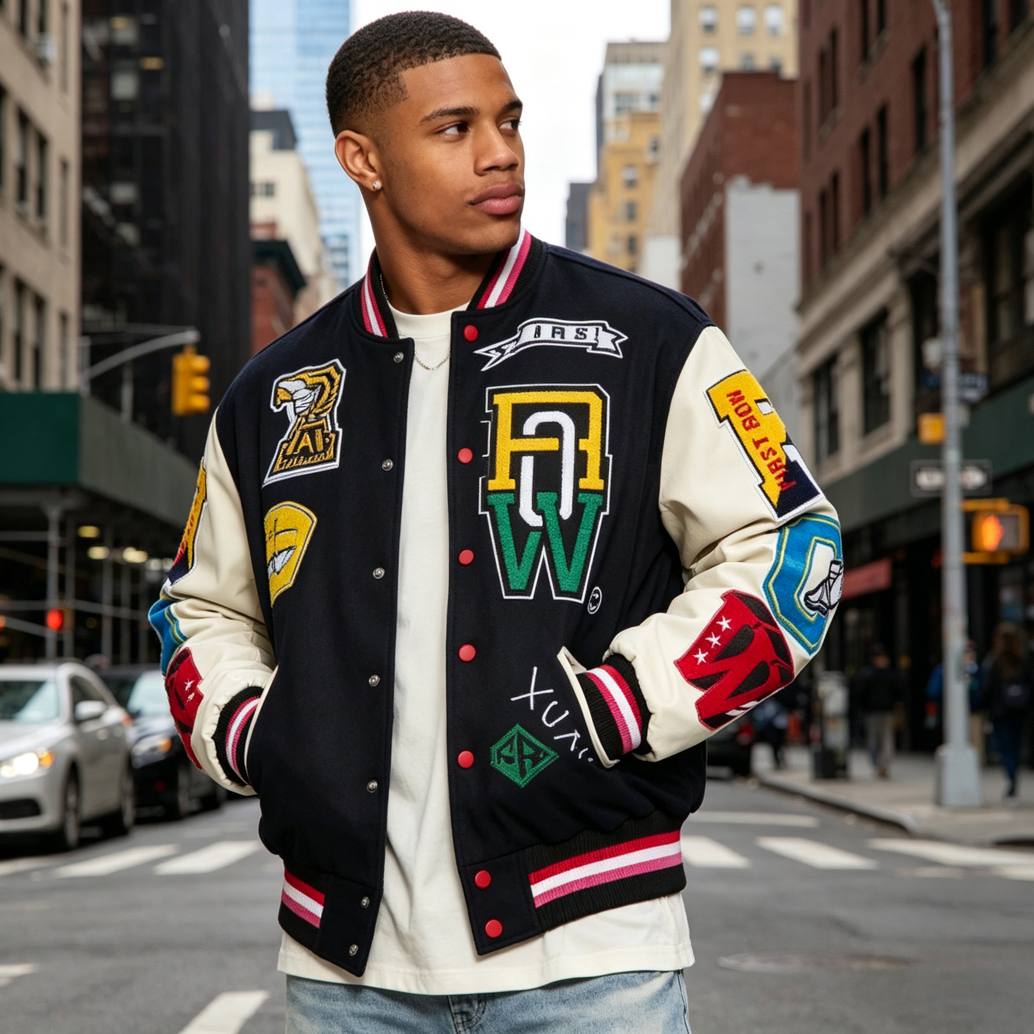 Chenille, embroidery, and applique do not sit on the jacket in isolation. Their visual balance usually depends on body fabric, sleeve contrast, and silhouette.