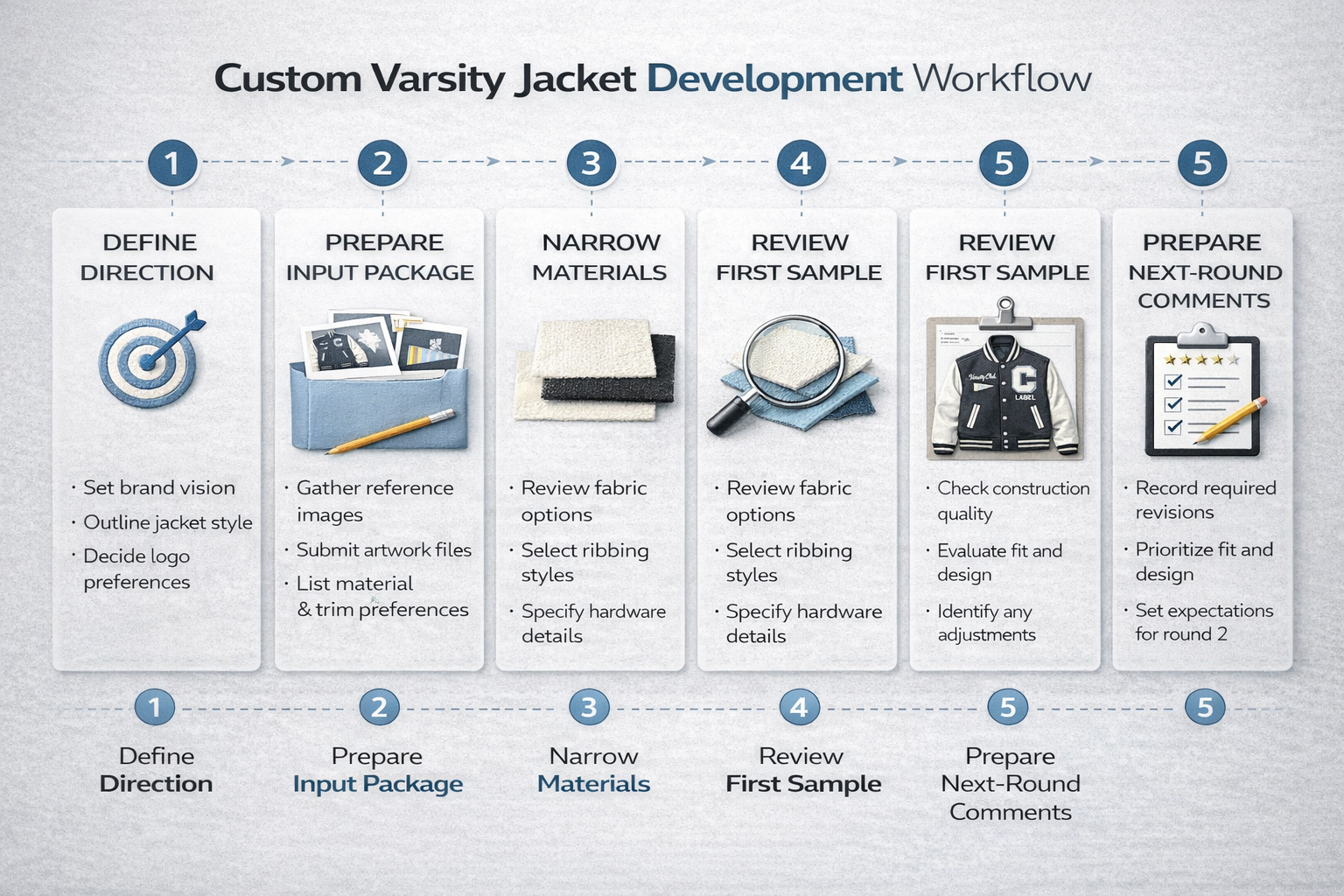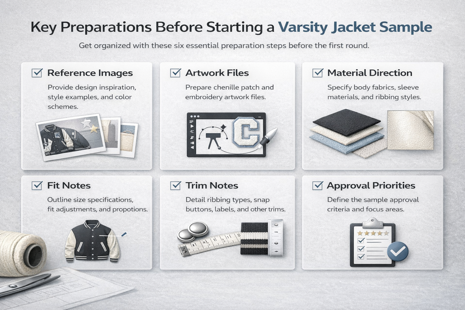 A varsity jacket sample usually moves faster when the buyer prepares the right inputs before development starts. The most useful preparation often includes a clear product direction, artwork files, material preferences, trim notes, fit comments, and a realistic approval order. In B2B manufacturing, better preparation often leads to fewer revisions, clearer communication, and a more workable sample path.