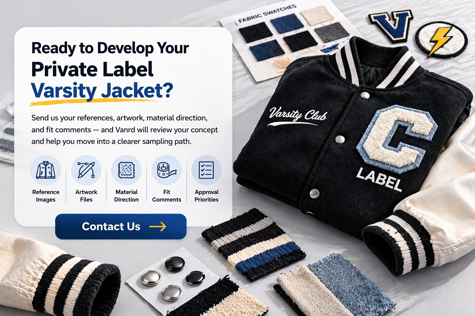 If your brand is planning a private label varsity jacket program, the easiest way to reduce sample revisions is to start with a clearer input package and approval order. Send your references, artwork files, material direction, and fit comments to Contact Us so Vanrd can review the concept and help you move into a more workable sampling path.
