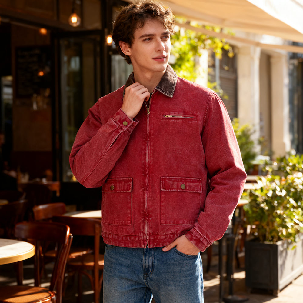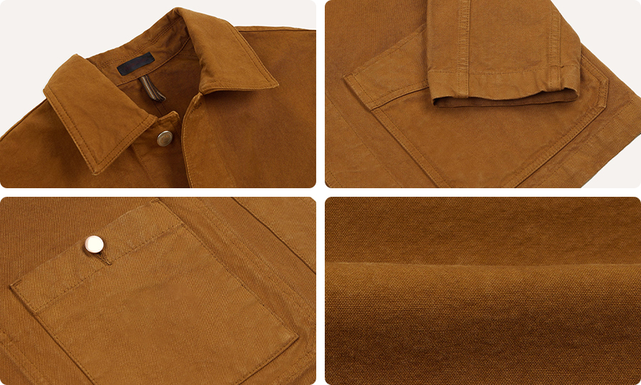 include cotton twill, poly-cotton twill for better colorfastness, and denim for vintage looks. Collars can be self-fabric or corduroy. Finishes: