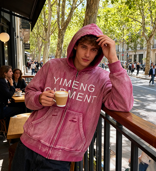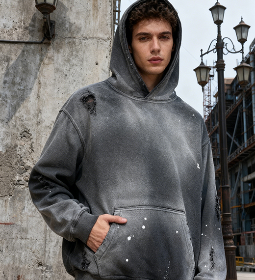 On this page we highlight that vintage character is often driven by pattern work and surface detail, not just graphics. We develop panel layouts for dropped shoulders, side panels, double-layer hoods and gusseted underarms so the hoodie moves well and ages attractively. Pocket options include classic kangaroo pockets or cleaner welt pockets, both tested for their behaviour under washing and distressing. Distress zones, raw edges, darting and coverstitch lines are all checked in sampling to avoid seam blowouts in bulk, balancing aesthetics with long-term durability.