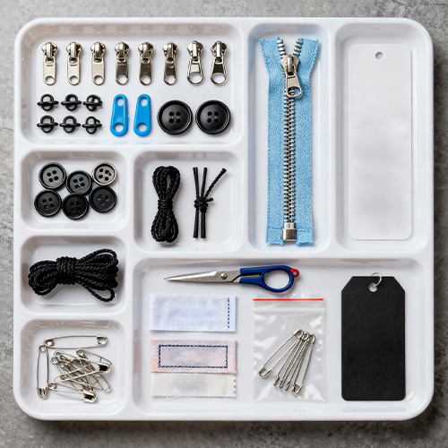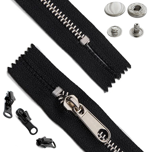 Zips, snaps, rib knit, elastics, woven/heat labels.
