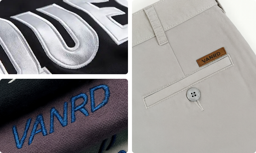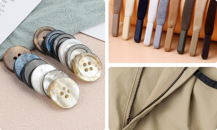 confirm fabrics, waistbands, zips and hardware