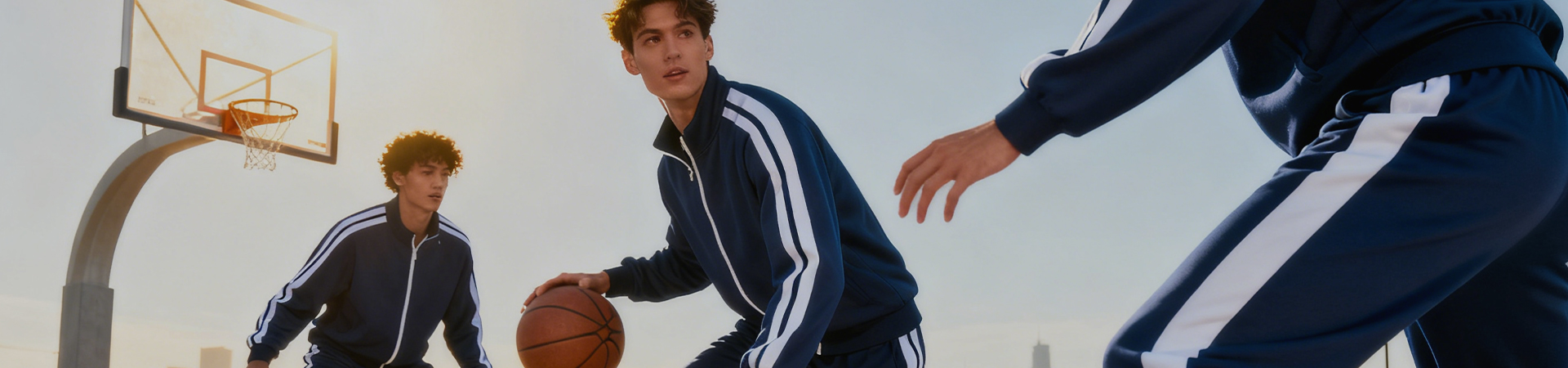 Fashion-led tracksuits with bolder cuts, colour blocking and trims, built for drops and brand capsules
