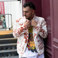 Pattern denim jacket with full-body print and clean zip styling; wholesale and bulk supply with custom options supported.