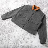 Duck canvas utility jacket with contrast corduroy collar and metal toggle front; smooth lining and flap pockets
