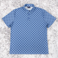 Allover geometric custom printed polo t shirts in breathable poly knit for golf and resort brands.
