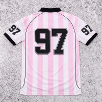 Pink striped polo-style custom soccer t shirts for teams and brands, ideal for OEM and private label projects.