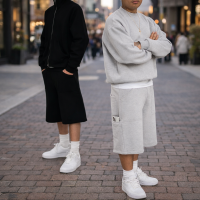 Custom sweat shorts in cotton-blend fleece with patch pockets and a relaxed fit for private label streetwear.
