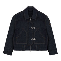 Custom denim jacket in dark indigo with buckle front and cropped fit for private label streetwear.